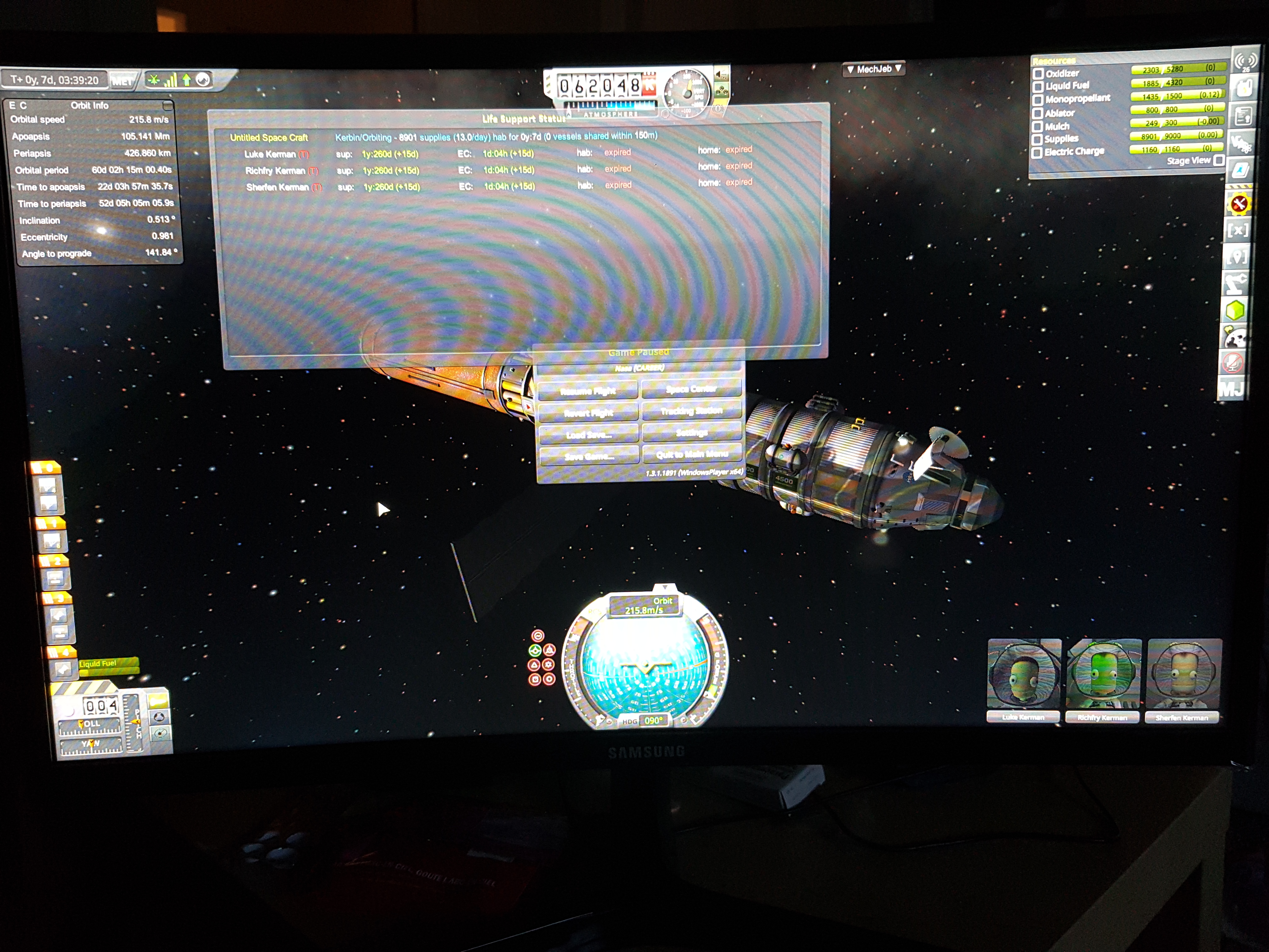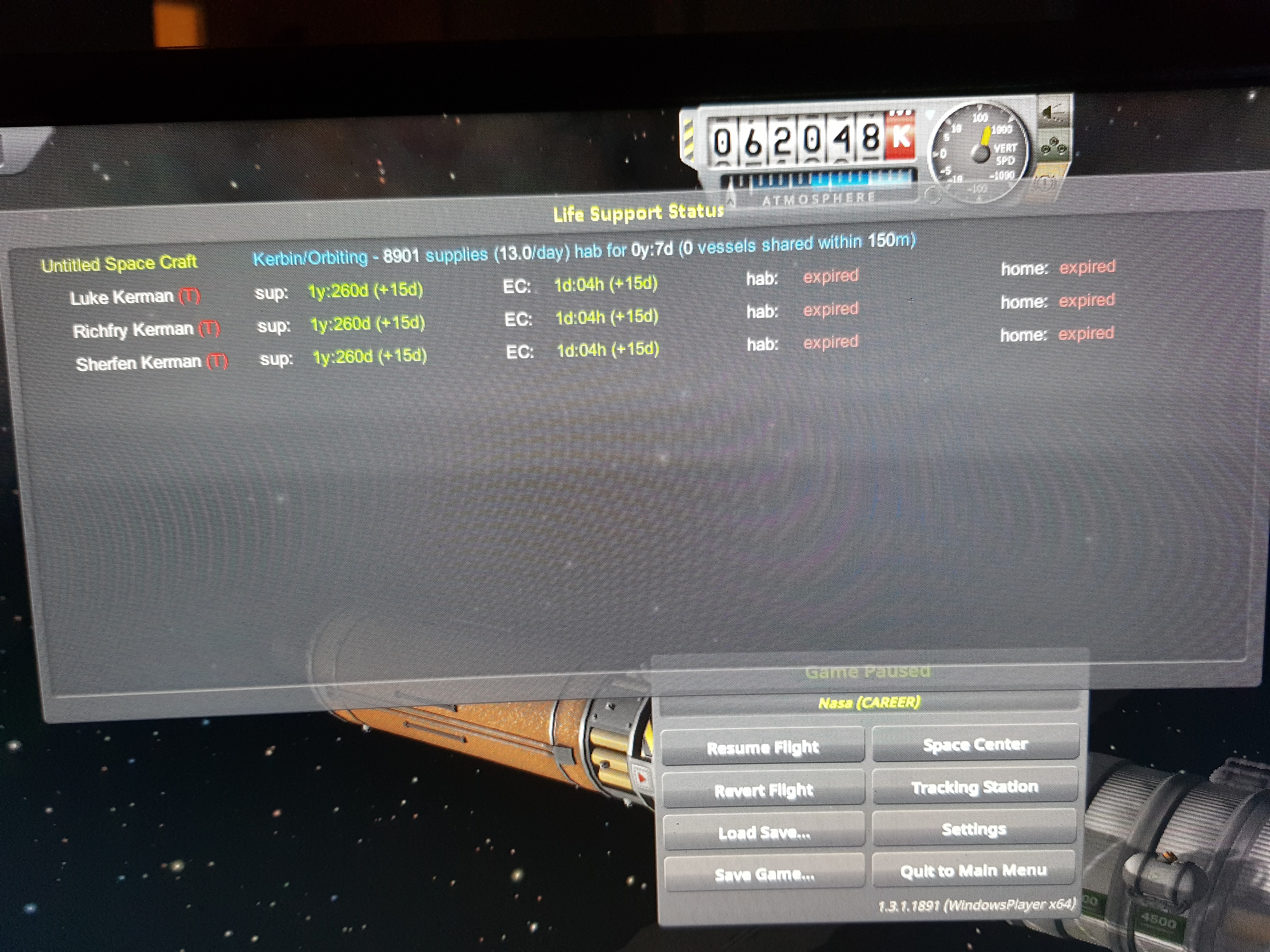 Ich habe meinen Kerbals genug Supplies mit gegeben. 9000.^^ Aber dennoch ist es so das nach gewisser Zeit die den Dienst einstellen obwohl sie Futter haben. Laut Anzeige mehr als 1 Jahre.