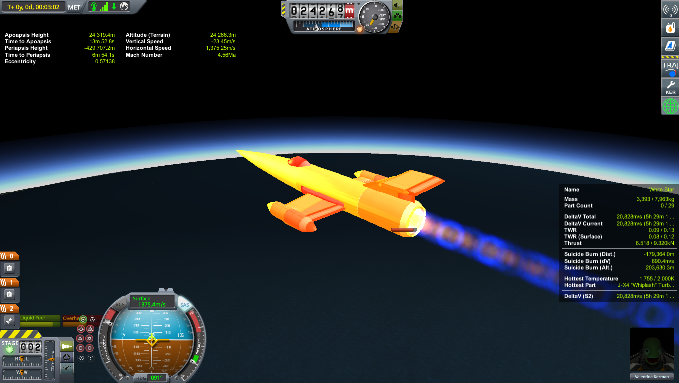 Dieses schicke SSTO bringt insgesamt 3 Kerbals auf einen 1000 Km Orbit und kann dort an einer Station andocken. Das stark luftwiederstand-reduzierte Design ermöglicht eine hohe Beschleunigung bereits in den unteren Luftschichten und macht es so leichter, Geschwindigkeit für den Flug in eine Umlaufbahn aufzubauen. Zudem ist der Wiedereintritt wesentlich ungefährlicher, da die Hülle eine Menge Hitze vertragen kann.