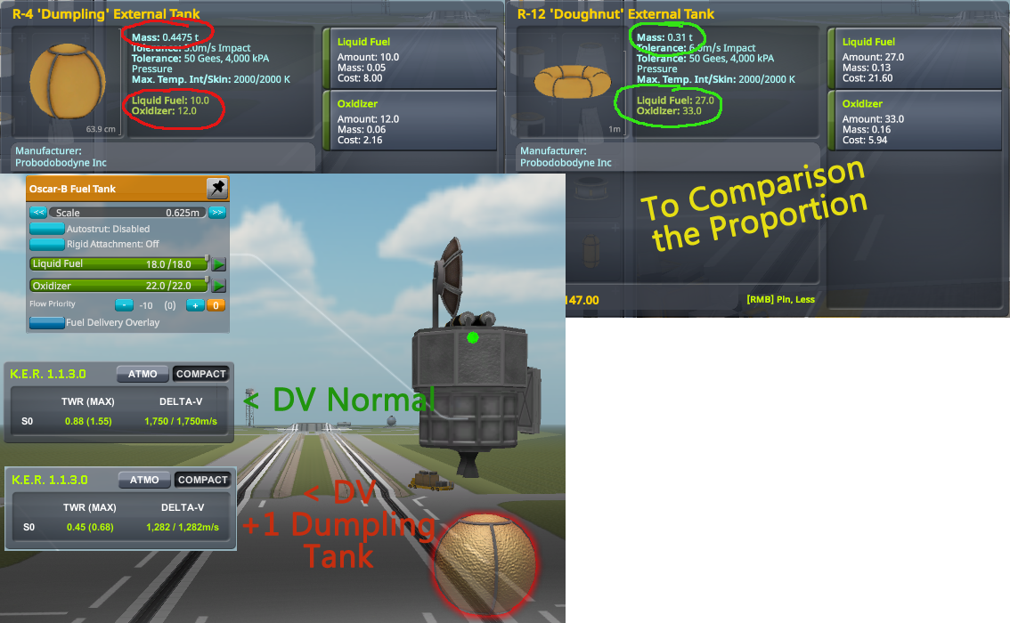 Allein bei der Delta V Anzeige müsste man schon stutzig werden (Ich habe knapp 500m/s weniger, obwohl ich einen Tank mit Treibstoff hinzufüge, Hallo?!).Das Volumen wird ja praktisch durch die Füllung vorgegeben (damit bin ich auch einverstanden) und nun gehe ich einfach mal davon aus, dass das orange Material aus dem die Tanks bestehen, alles das selbe ist und wenn ich das nun aber ins Verhältnis setze, bekomme ich extreme Werte. Es ist als ob die Hülle aus Blei wäre - versteht man denn nicht was ich will?