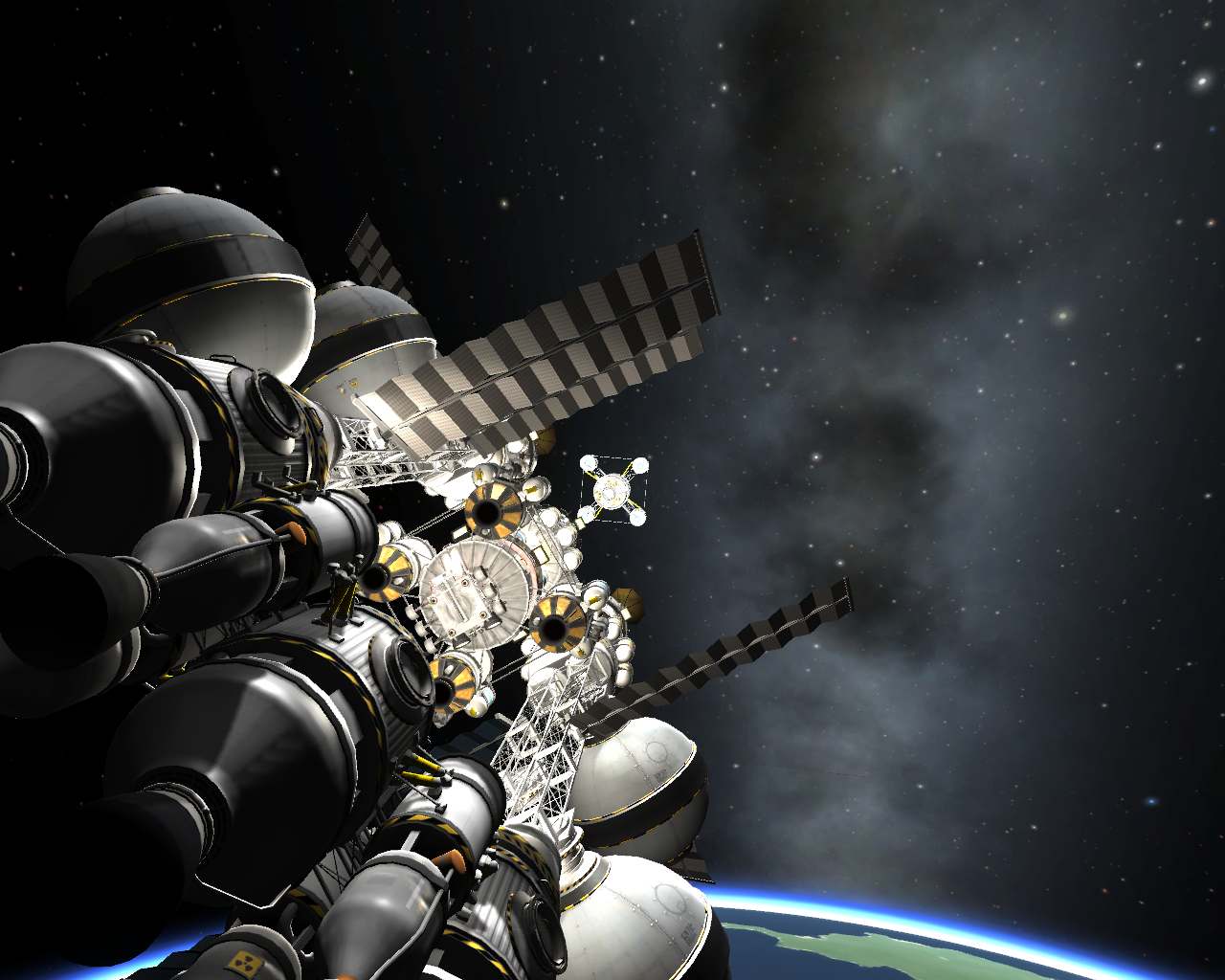 • Raumstation die fähig ist den Kerbinorbit zu verlassen. Die Enginestage besteht aus 4 Atomtriebwerken einem Habitat und 4 Rettungskapseln für die 4 Mann starke Besatzung. Die Centerstage erzeugt Elektrizität über 4 Grosse Solarpanele.