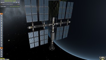Es ist nur ein Kerbal oben. Ich habe aber noch 3 Container, aber keine Lust mehr hochzufliegen. Das letzte Teil habe ich mit 2 FPS angedockt, das ist sehr anstrengend.