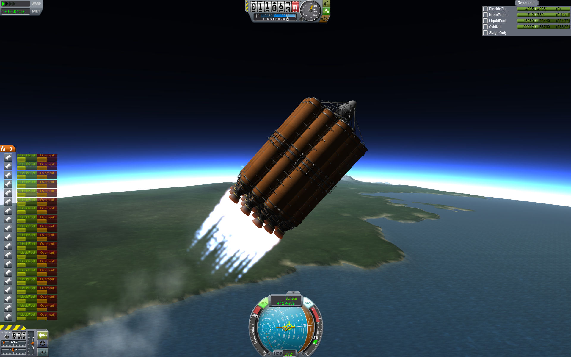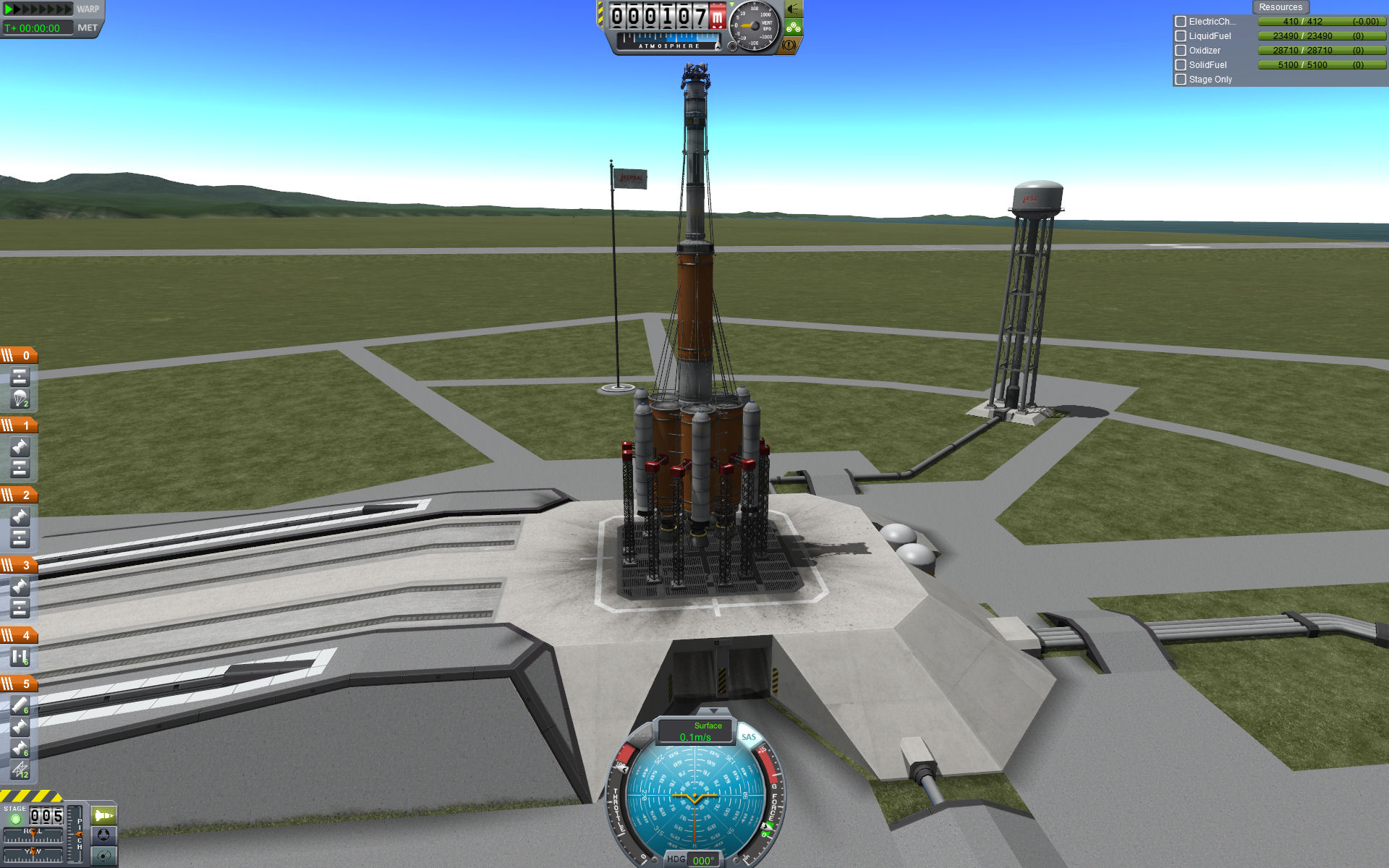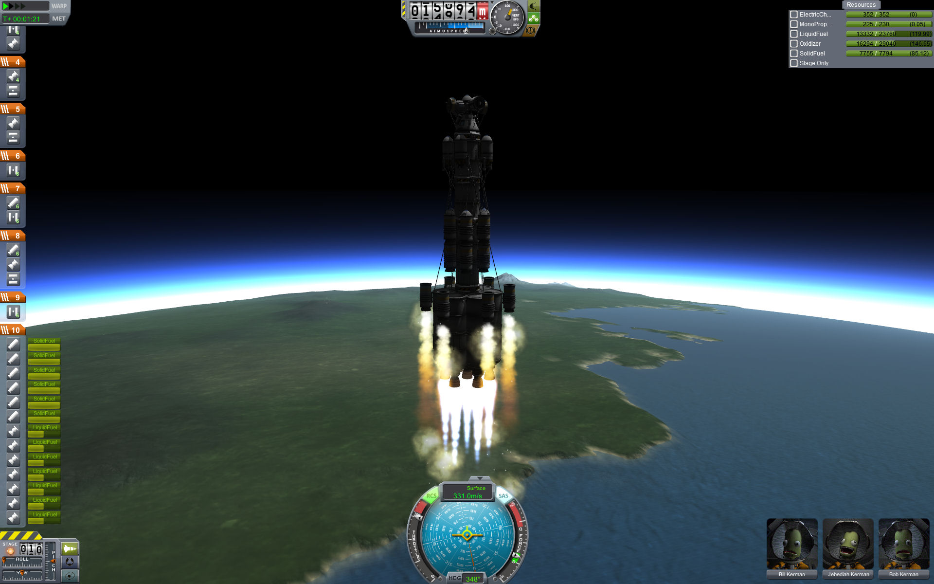 1. Start (Trägerrakete mit Rover auf der Startrampe / Abflug erfolgt in Richtung Umlaufbahn Kerbin / Jeb kann es kaum noch erwarten)