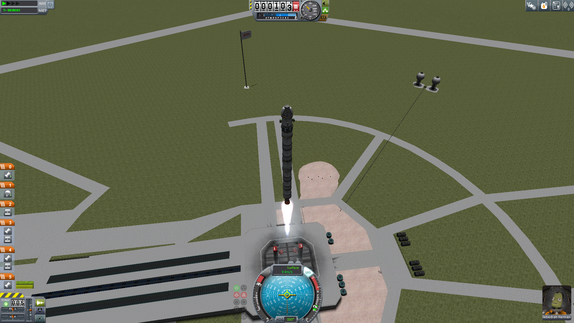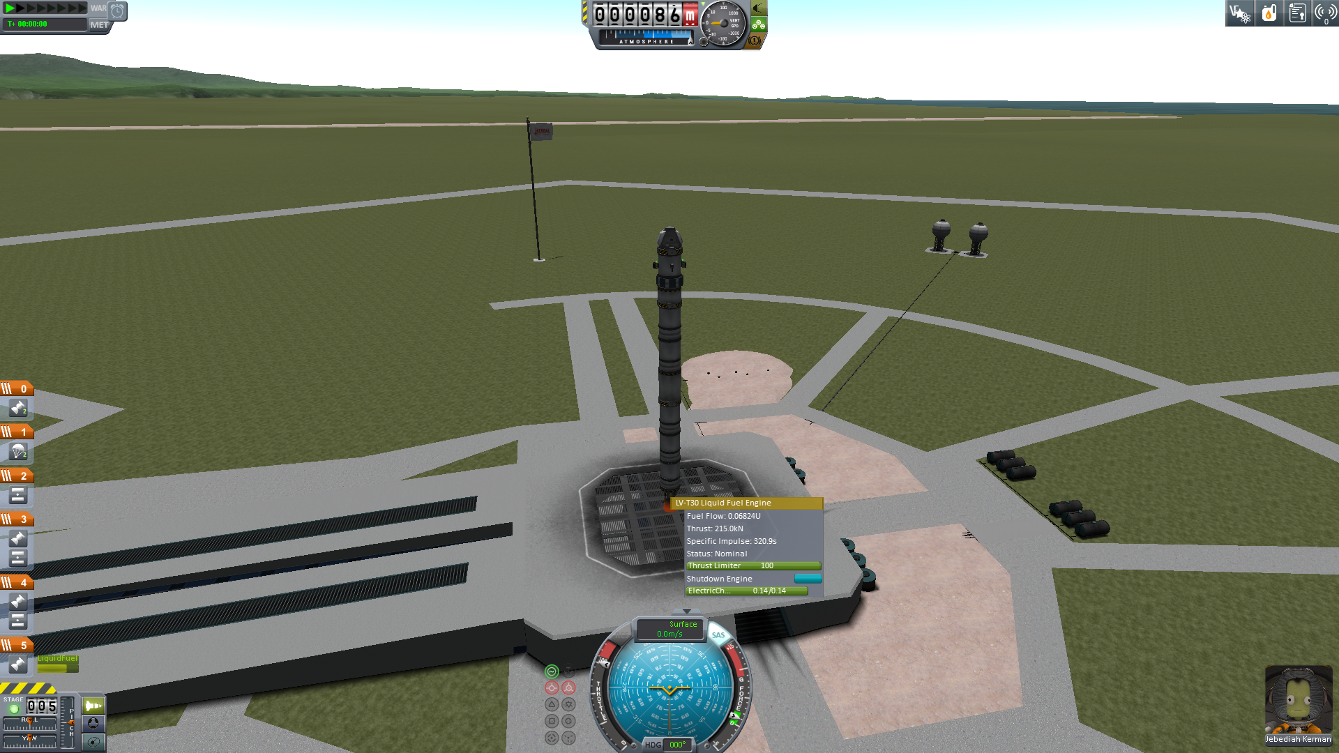 Diesen Raketentyp verwende ich immer wieder für kleinere Aufträge, wie das testen von "Small Gear Bay" oder kleiner Triebwerke wie "LV-1, LV-1R" in Kerbin-Orbits. Das funktioniert normalerweise ohne Probleme. Manchmal ist es trotzdem unmöglich, trotz 100% Leistung abzuheben, wie man auf dem ersten Bild erkennen kann. Recover und erneuter Startversuch führen zum gleichen Ergebnis. Die Rakete steht wie angeschraubt auf dem Boden.