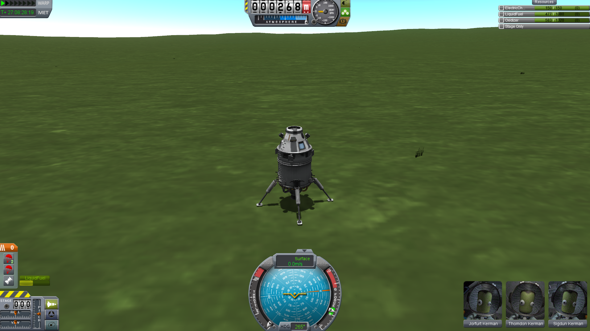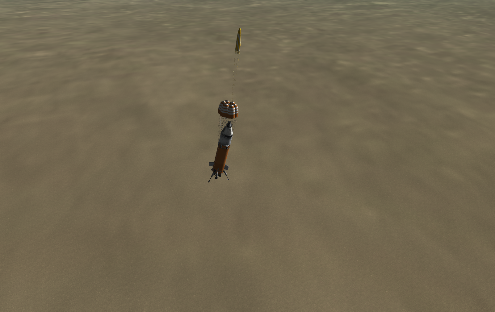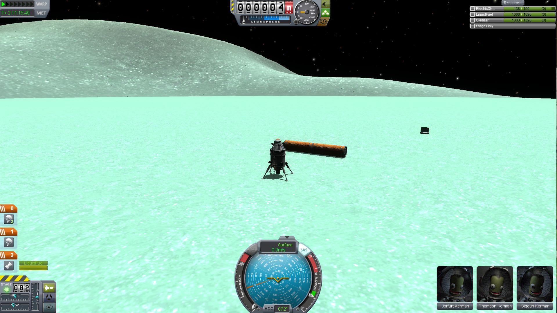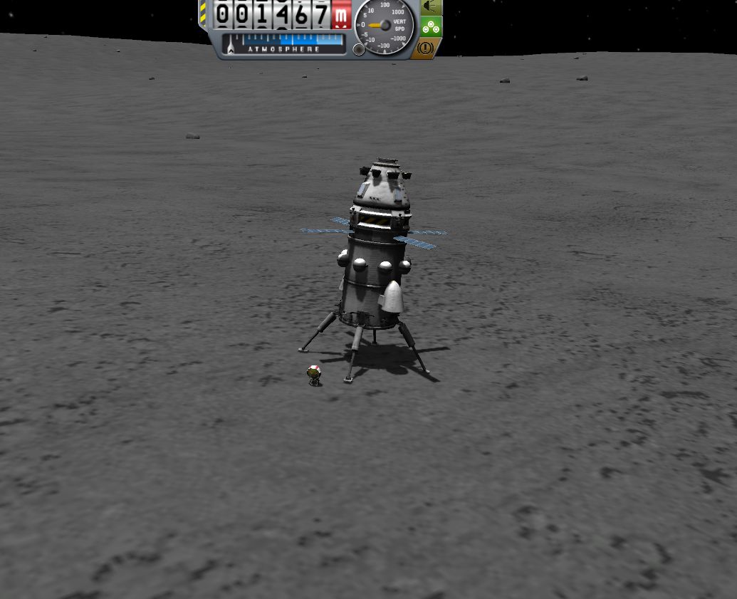 Bin mit einer Rakete hingeflogen, hatte einen 1-Kerman-Lander und einen 2-Kerman-Lander dabei. Beim Start war noch ein 3-Kerman-Lander mit dabei, im Kerbin-Orbit bin ich dann in die 2 anderen Lander umgestiegen. Bin zuerst Ike angeflogen, dort mit dem 1er gelandet, dann mit dem 2-Kerman-Lander nach Duna. Kein Docking.