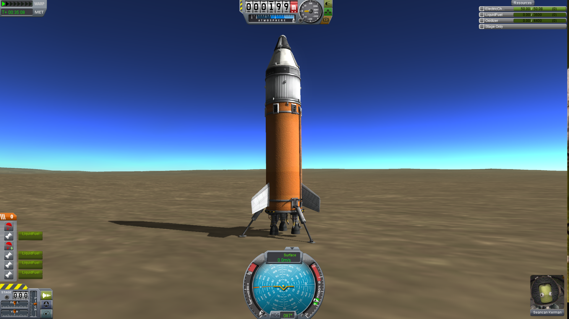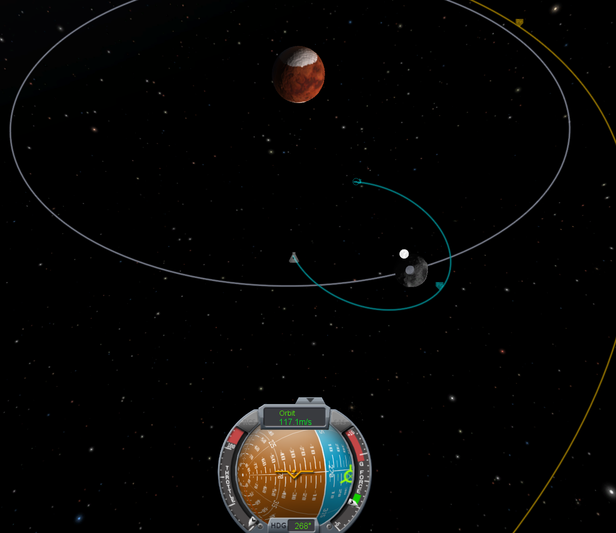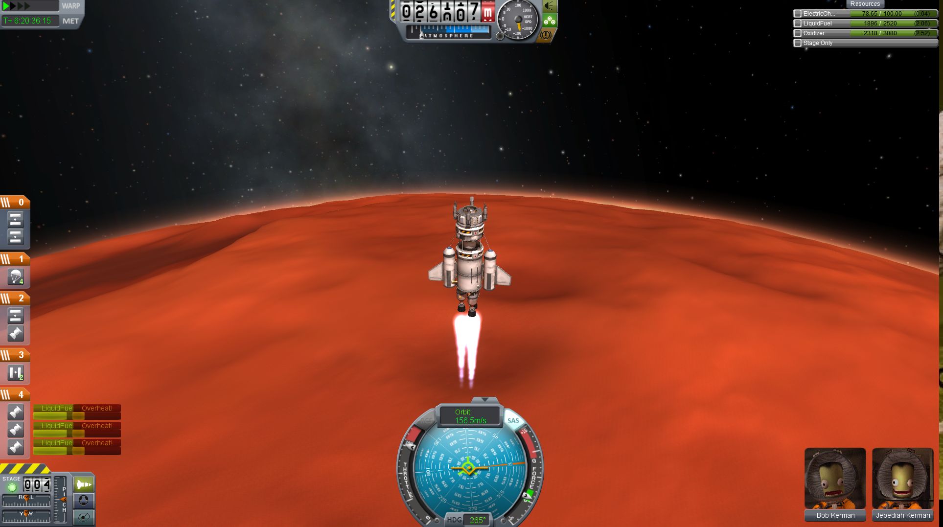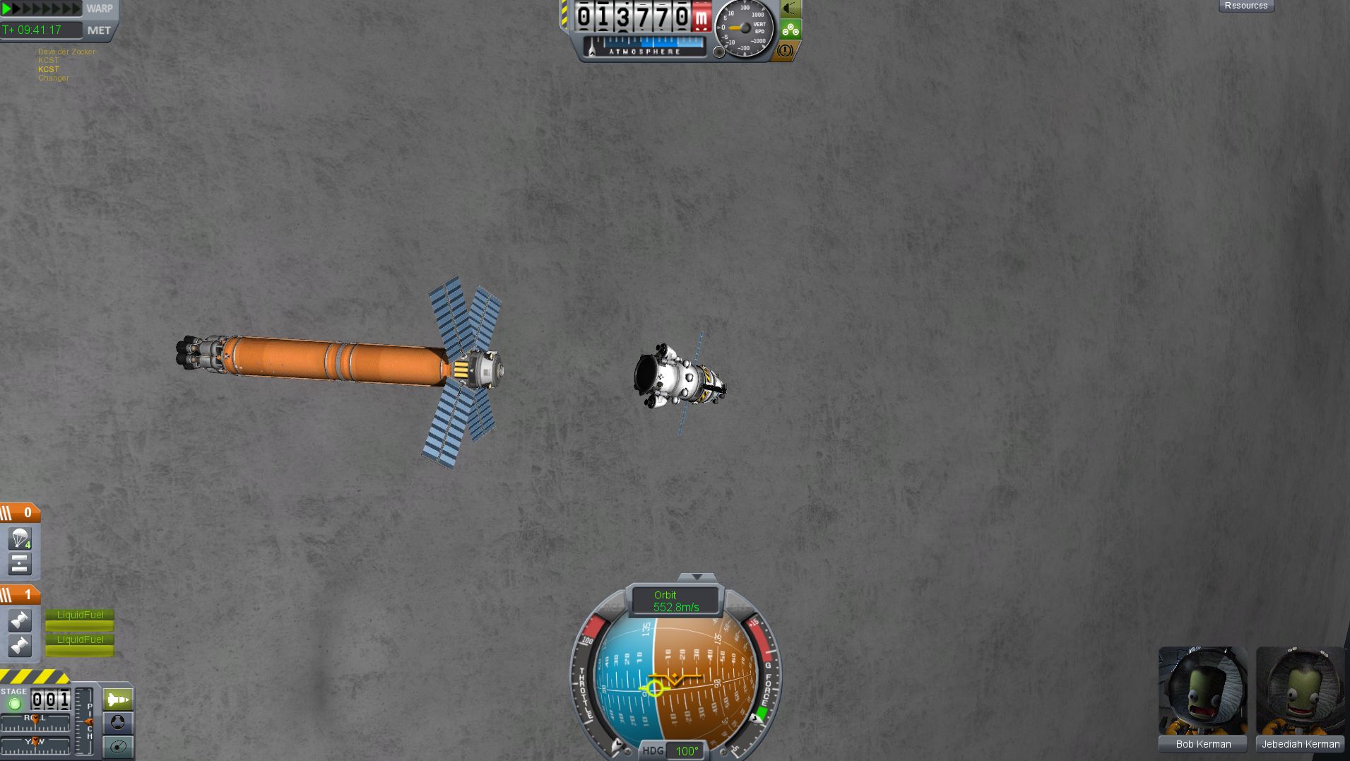 Bin mit einer Rakete hingeflogen, hatte einen 1-Kerman-Lander und einen 2-Kerman-Lander dabei. Beim Start war noch ein 3-Kerman-Lander mit dabei, im Kerbin-Orbit bin ich dann in die 2 anderen Lander umgestiegen. Bin zuerst Ike angeflogen, dort mit dem 1er gelandet, dann mit dem 2-Kerman-Lander nach Duna. Kein Docking.