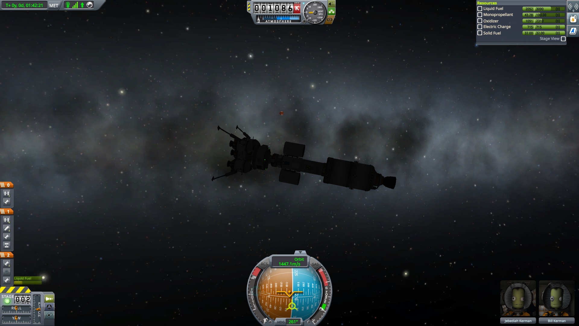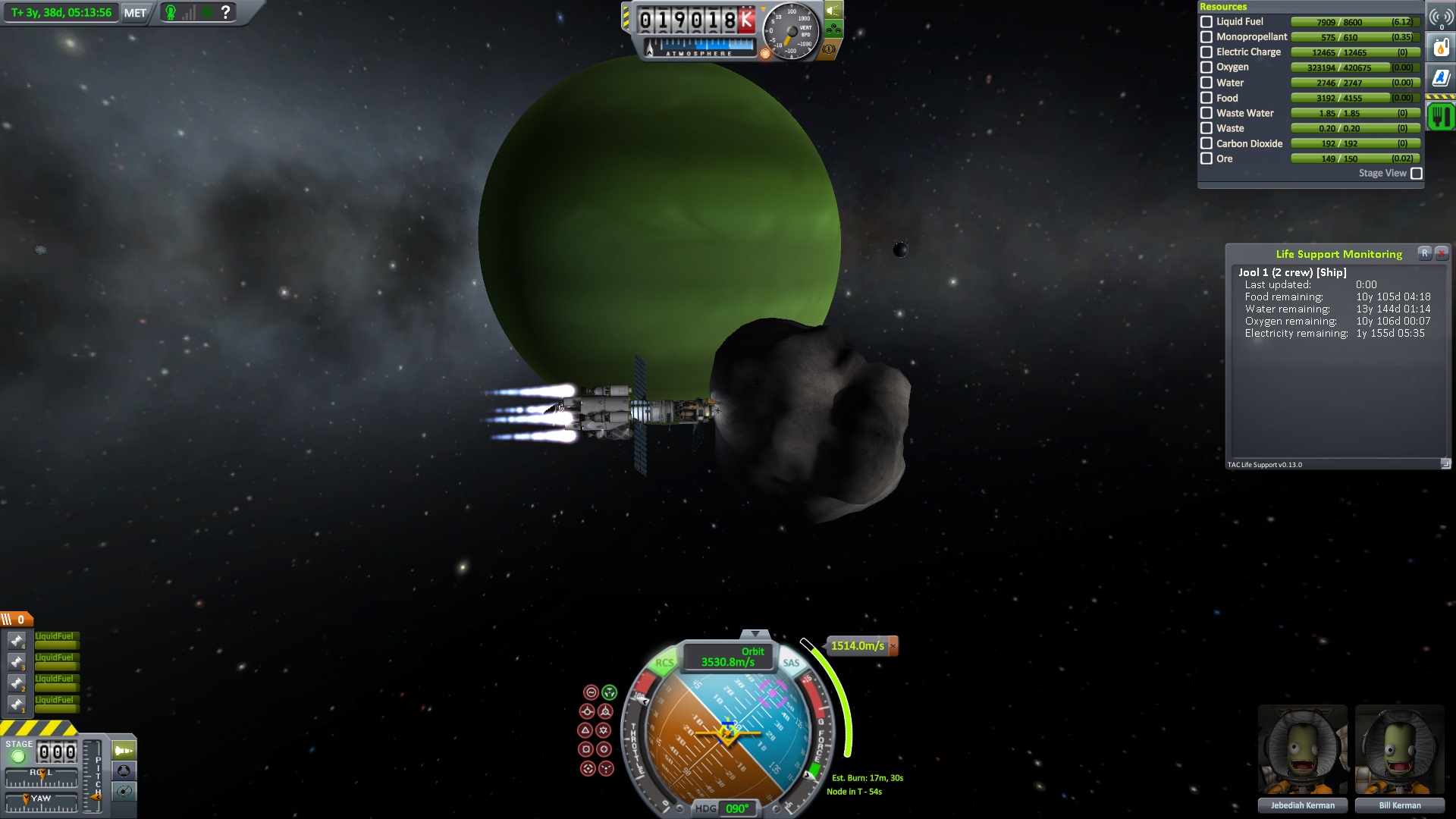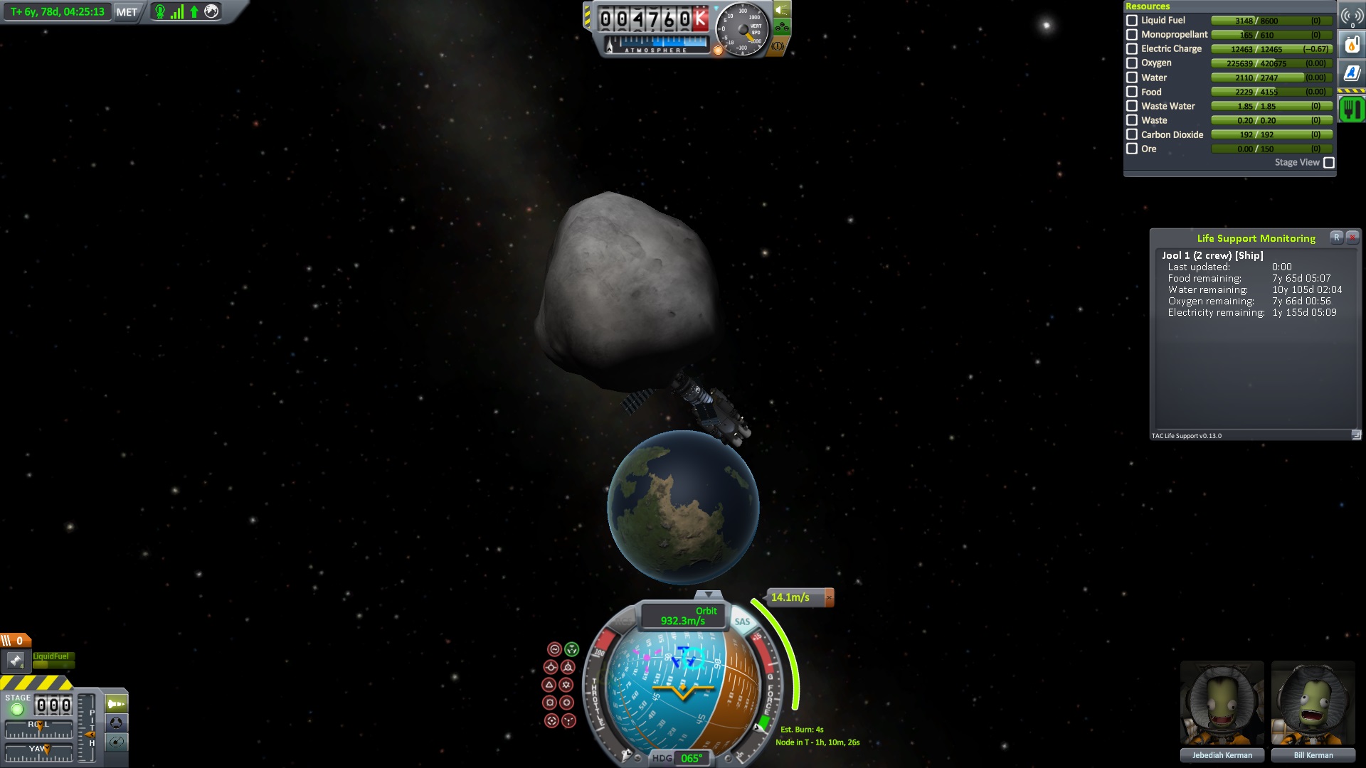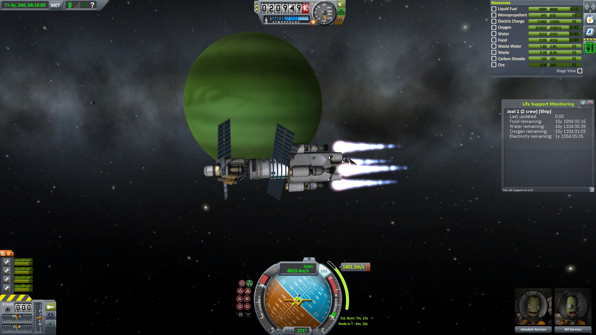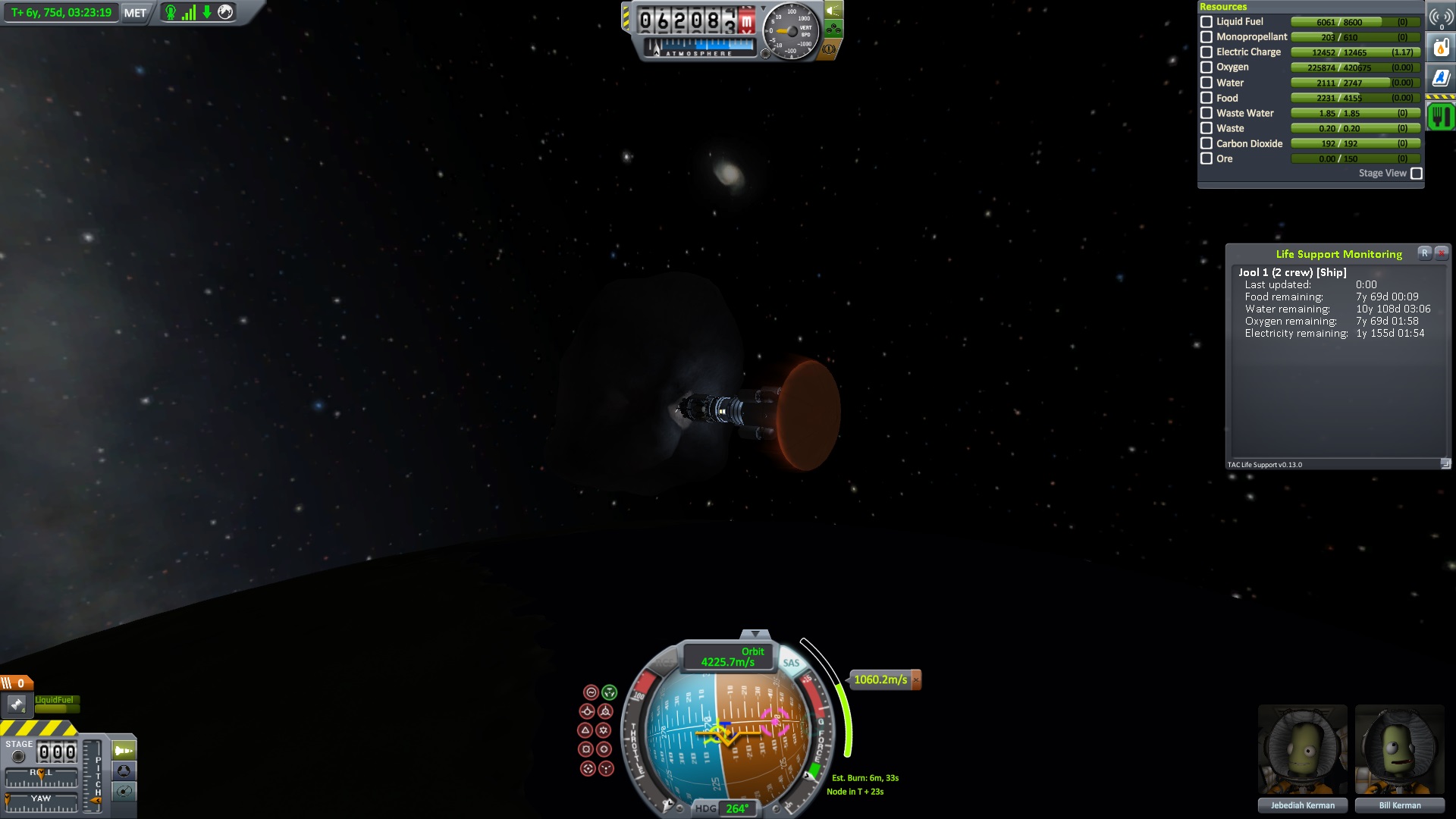 Nach dem die Position für das Bremsmanöver erreicht war zündeten die beiden Triebwerke. "Bill laufen die Triebwerke ?" fragte Jeb. "Ja" antworte Bill kurz, "warum fragst ?" Jeb: "Nun es fühlt sich nicht so an als wen sie es täten" "das wird knapp" dachte er, ließ sich aber nichts anmerken. Dann halt doch ne Vollbremsung