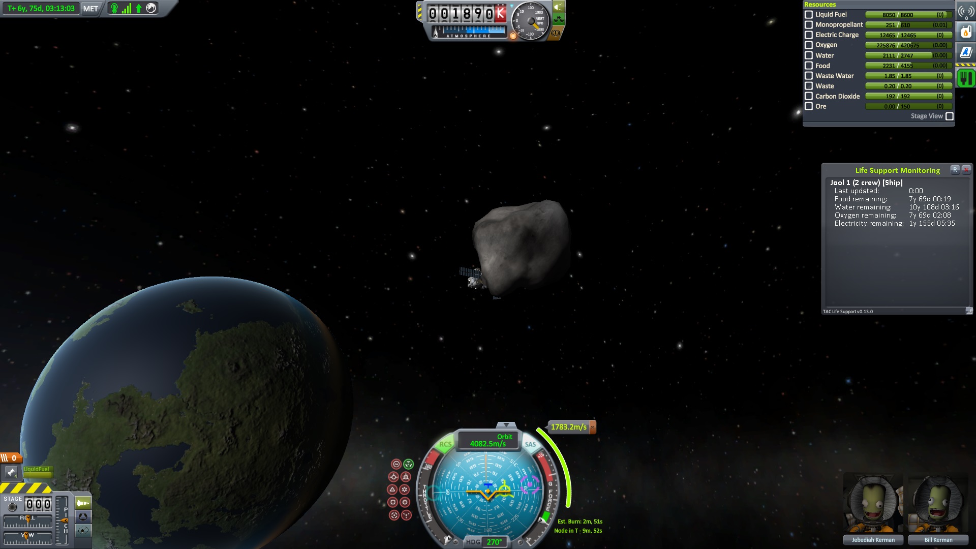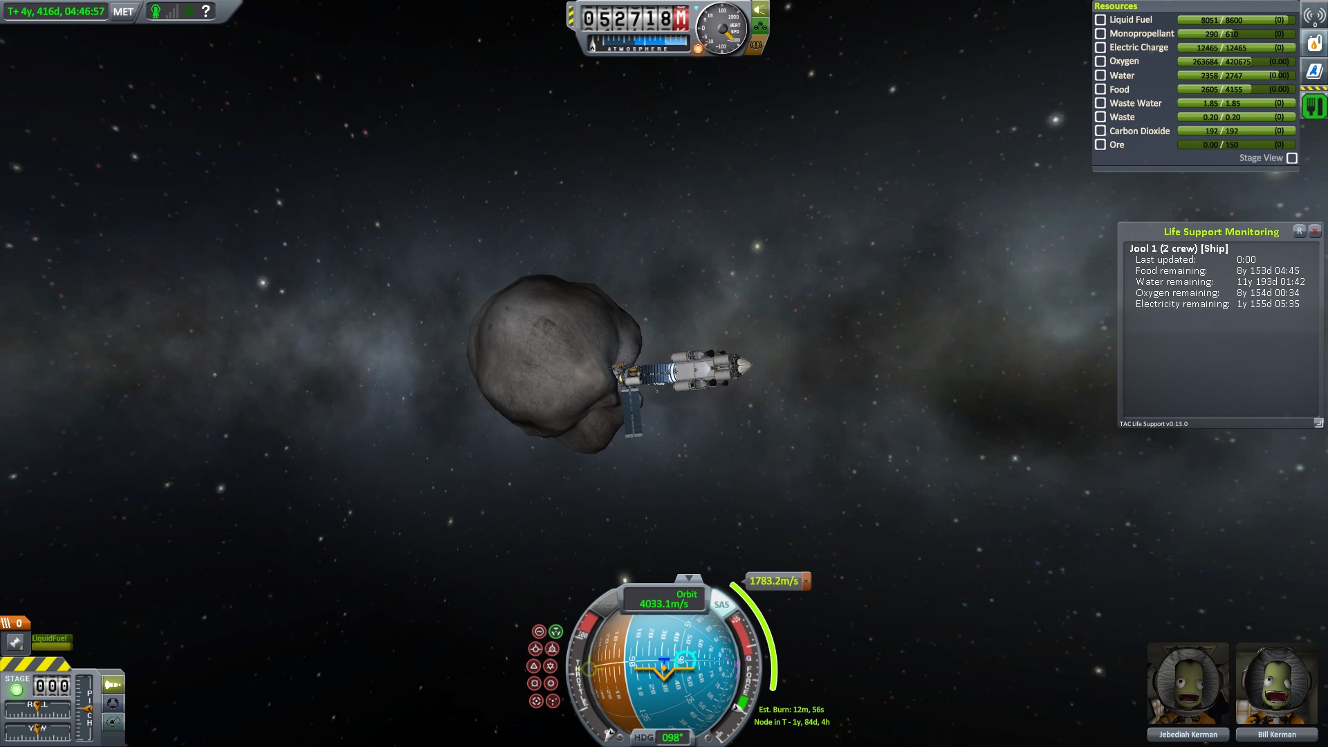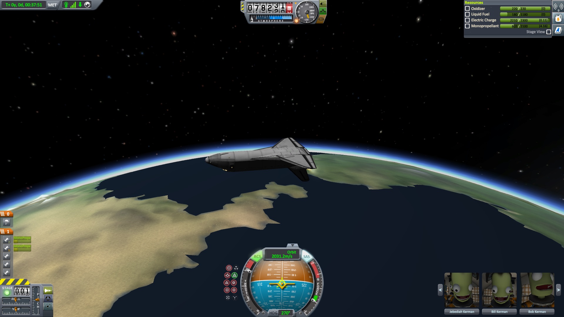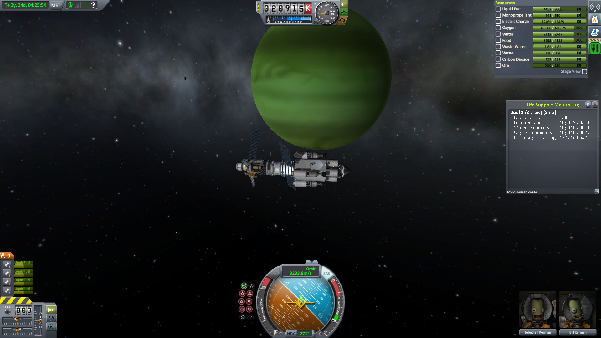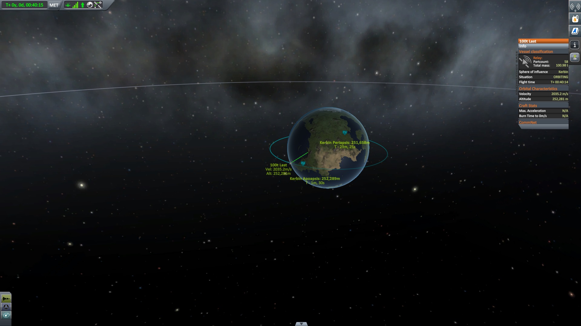 Nach dem die Position für das Bremsmanöver erreicht war zündeten die beiden Triebwerke. "Bill laufen die Triebwerke ?" fragte Jeb. "Ja" antworte Bill kurz, "warum fragst ?" Jeb: "Nun es fühlt sich nicht so an als wen sie es täten" "das wird knapp" dachte er, ließ sich aber nichts anmerken. Dann halt doch ne Vollbremsung
