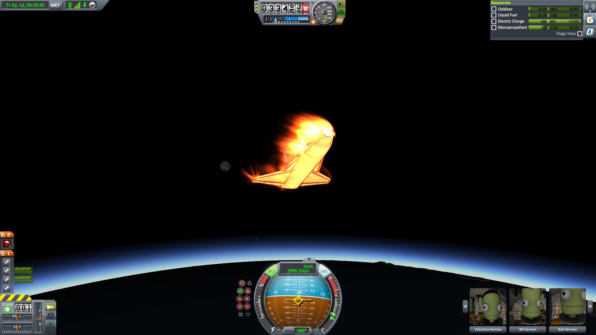 Wiedereintritt war beim ersten Flug recht anstrengend, mit lehren Tanks ist es etwas Instabil und neigt zum trudeln. Beim zweiten Flug habe ich ein den Treibstofffluß umgestellt, so das der vordere Tank der letzte ist der gelehrt wird. Dann war es unproblematisch beim Wiedereintritt und auch Landeanflug.