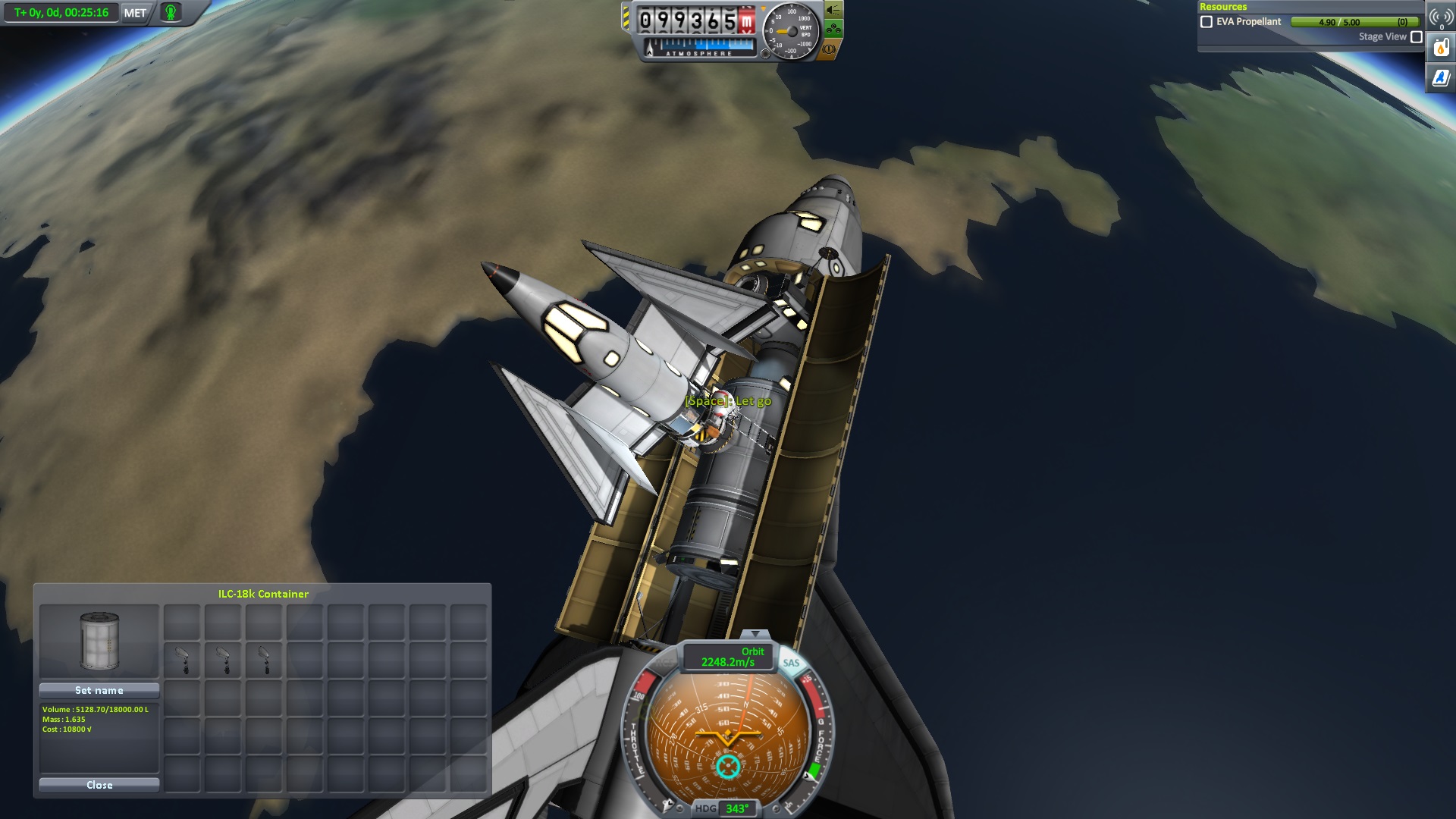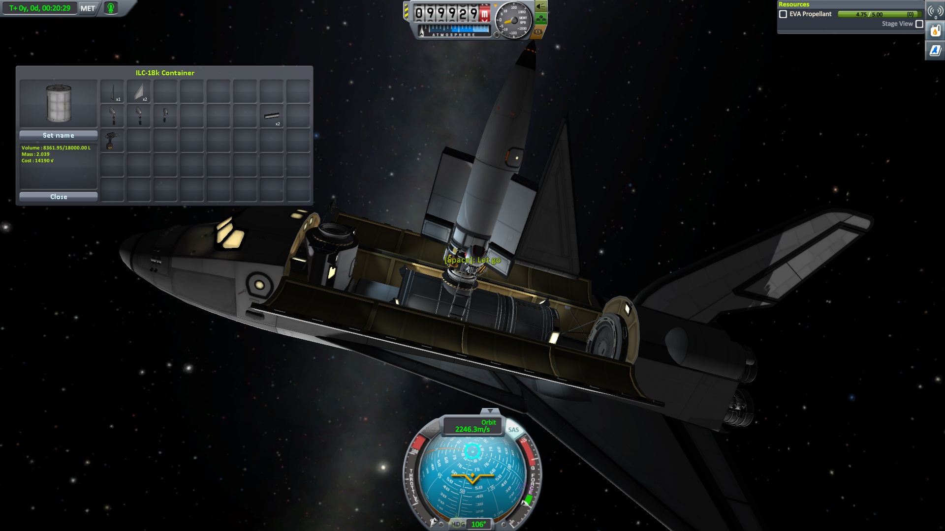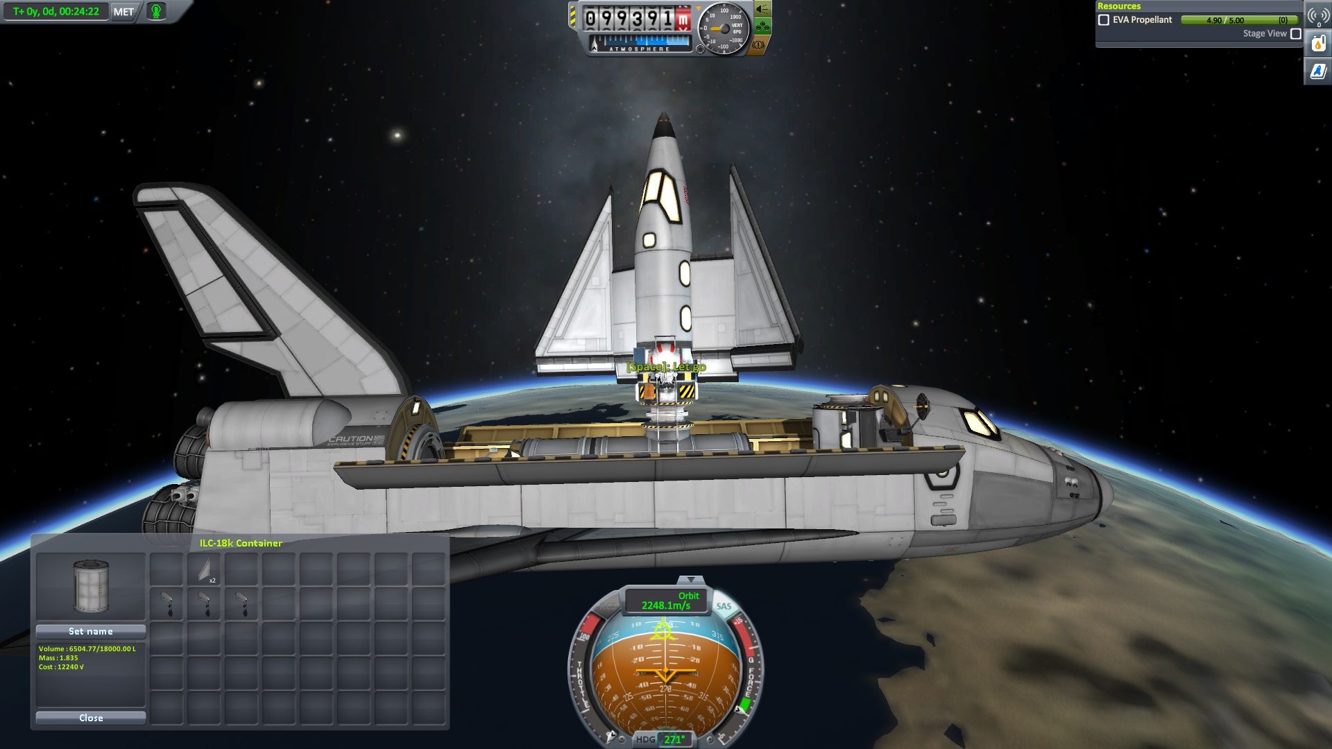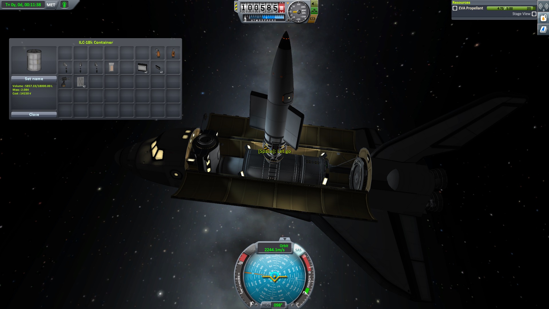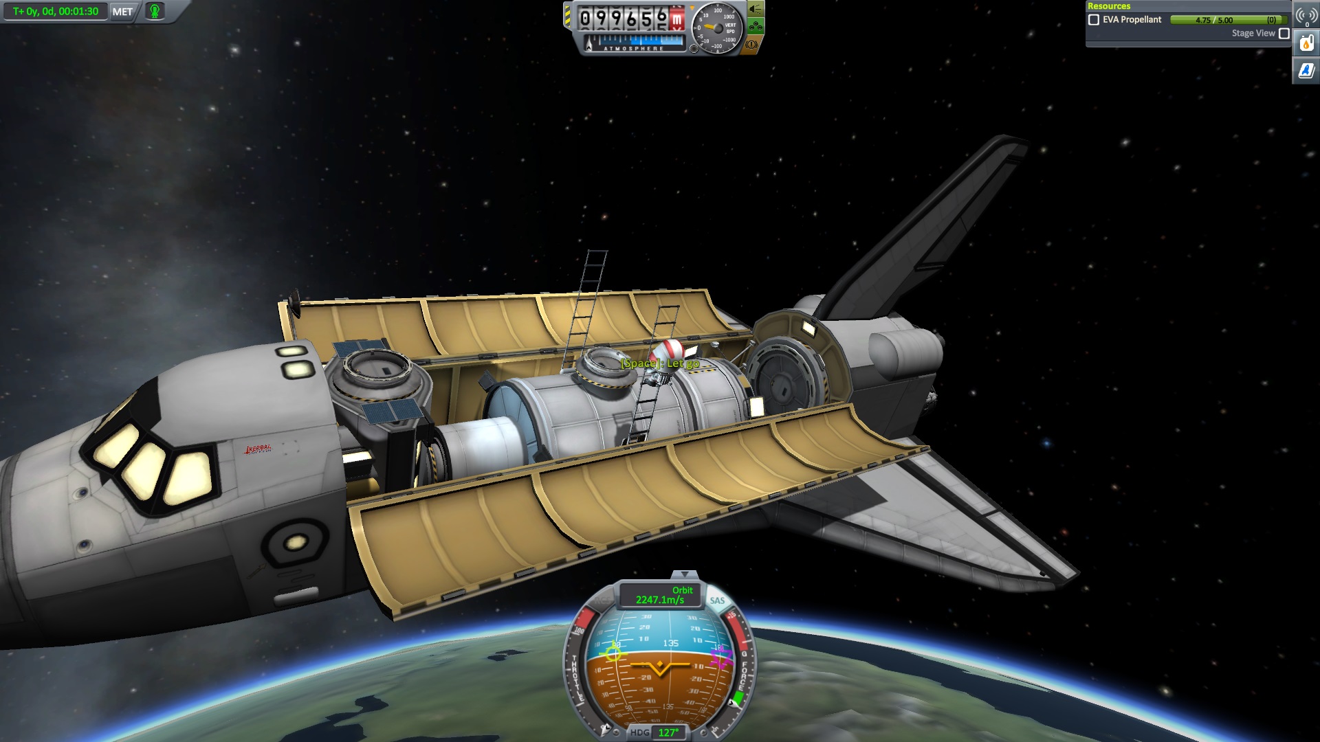 So staunten Jeb und die Anderen nicht schlecht als mal wieder das Space Shuttle startklar auf der Rampe stand und diesmal im Laderaum Lagerbehälter von der Firma KIS waren. Jeb war es egal, so konnte er wieder mal fliegen. Der Start verlief ohne Probleme und ein 100km Orbit war schnell erreicht.