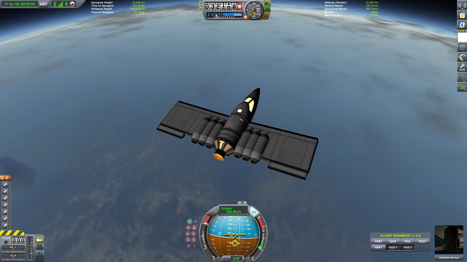 Habe für den Flug nur den nicht benötigten Oxidizer raus genommen, min 550 Einheiten. Das Gewicht davon kann man dann als Nutzlast nutzen. In den Orbit kommt man mit ihm wirklich sehr leicht. Hab es aber etwas anderes gemacht wie du in der Beschreibung, bin bei 8000m auf 20° gegangen und so auch geblieben. Bei 20000m hat man so gut 1200m/s bis 1300 m/s drauf. Wenn keine Beschleunigung mehr, die Rapier umschalten und Apo auf über 70km brennen dann auf 60km gleiten lassen und dann wie gewohnt gewünschten Orbit brennen. Mit den 45° bei 22000m bremst du das SSTO nur unnötig aus.