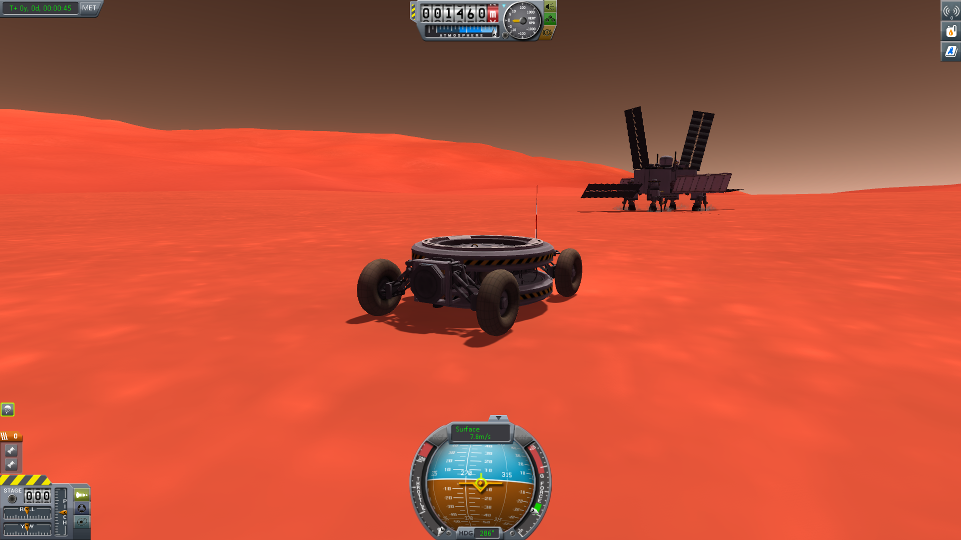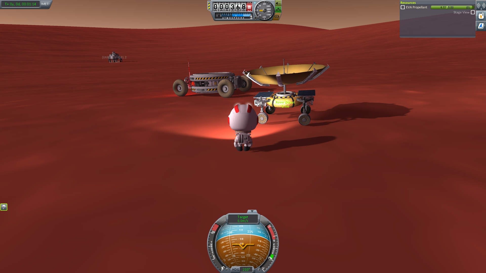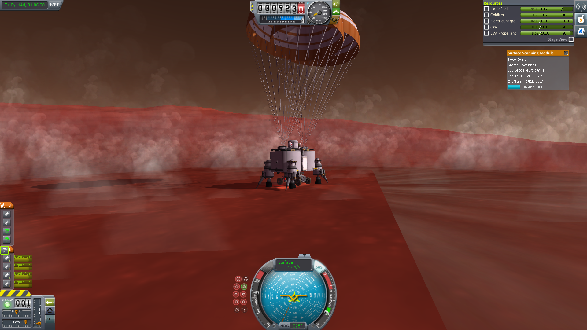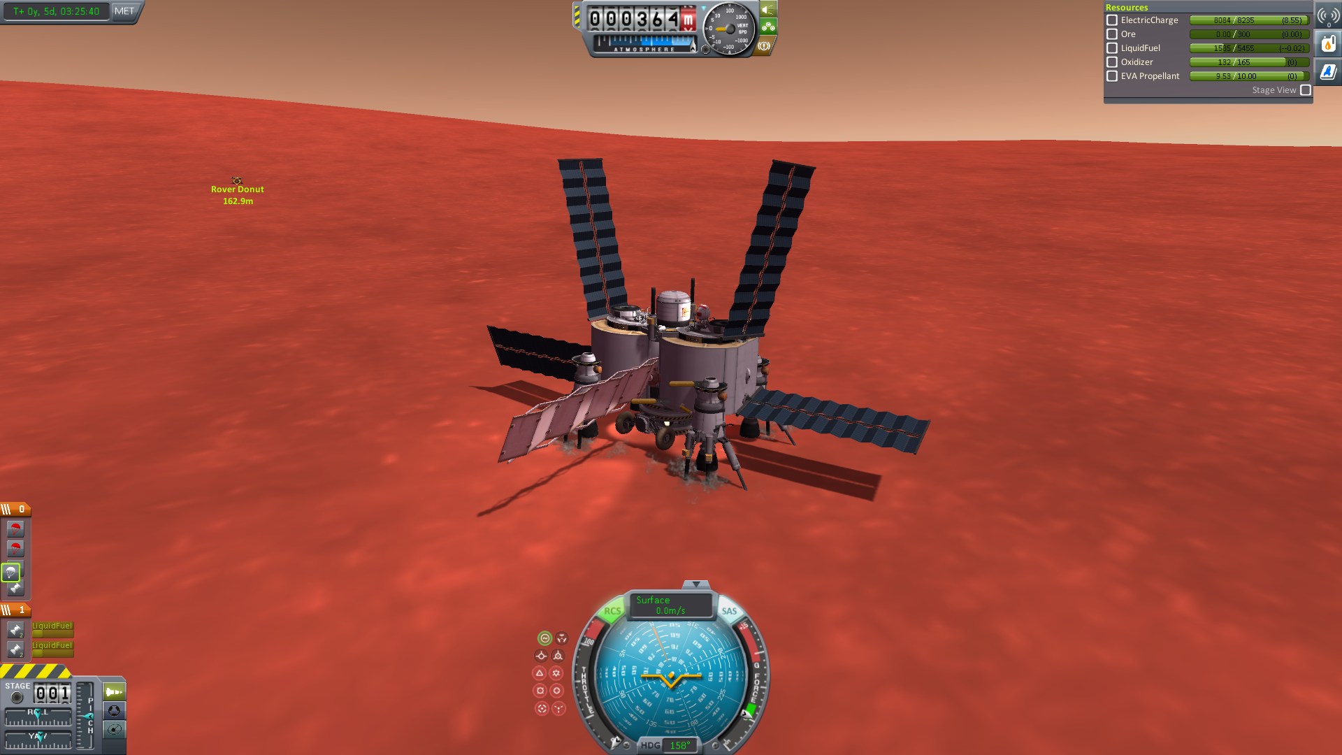 Da wir bereits auf Duna sind haben wir uns dazu entschloßen keine Sonde zu "Donut" zu senden sondern das machen wir gleich selber... (zum Glück gab es auch an diesem Landepunkt genug Ore)nach der Landung musten wir feststellen das der Rover auf dem Kopf liegt, ein kleiner Schubs und das Problem war behoben, da wir in der nähe auch noch Terrier Engines gefunden haben vermuten wir das hier ein Skycranemaneuver durchgeführt worden ist welches durch den starken schub beim wiederaufstieg des Landemoduls den Rover umstürzen ließ. (warum wurde uns das nicht mitgeteilt das es nur ein Unfall war ? hat die KASA etwas zu verbergen ?)