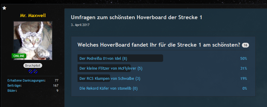Die Challenges konkurrieren ja schließlich nicht! Und ich gebe KCST auch völlig recht, das Hoverboardrace ist gerade mal ein paar Wochen beendet und Allan du hast keinerlei Interesse gezeigt an solchen Rennen teil zu nehmen, und fragst jetzt wo das KA denn bleibt.