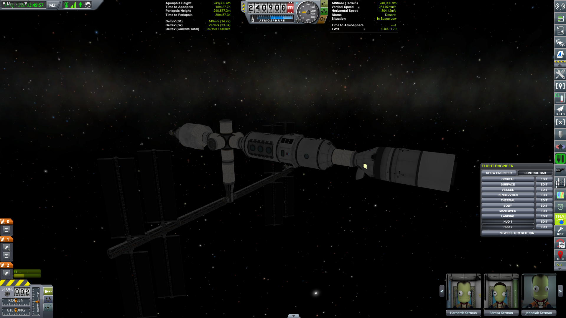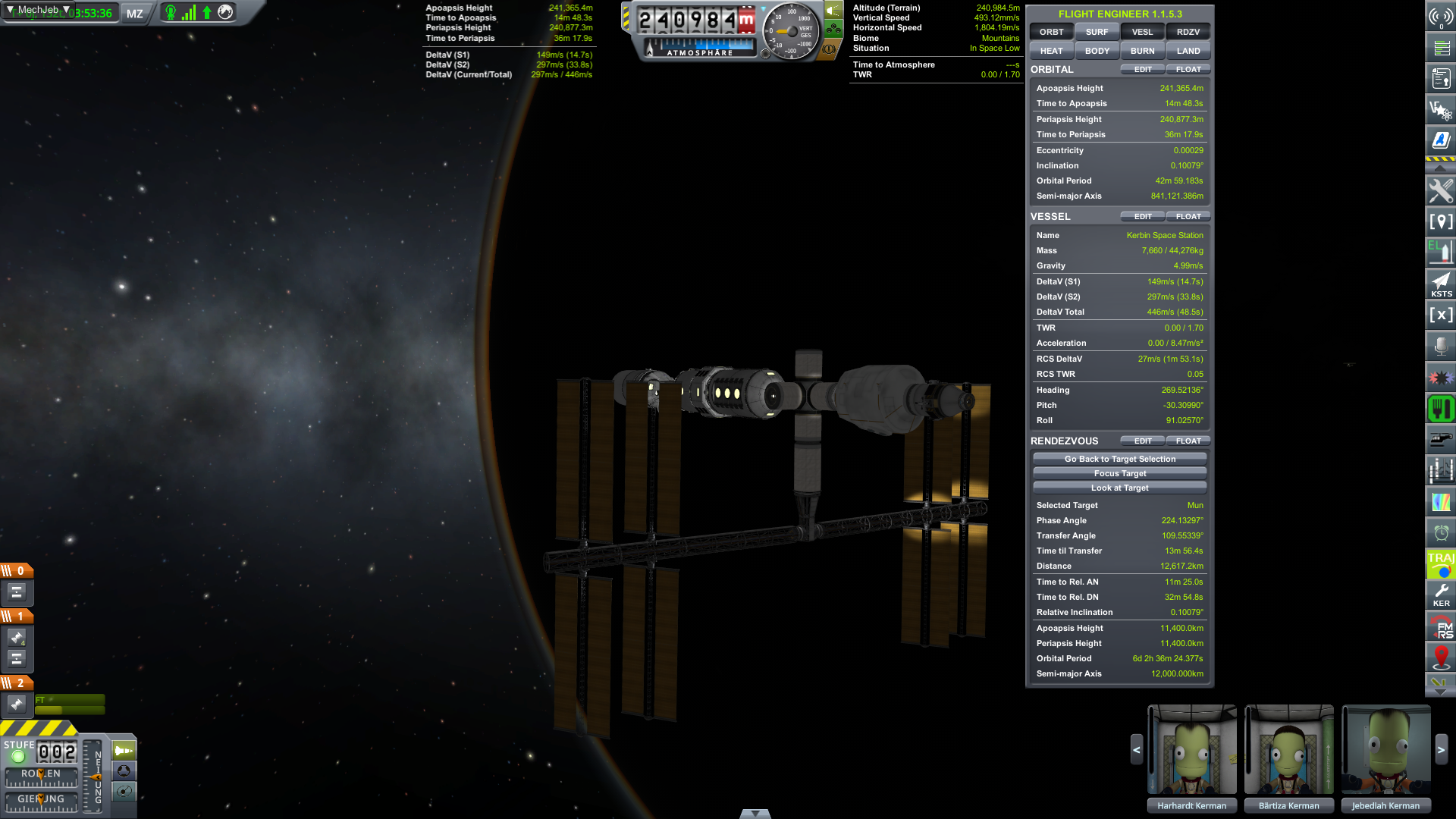 Hiermit kann man die Planung im VAB für die oben beschriebene Mun Mission bestens durchplanen. Der Engineer kann aber noch viel mehr! im Flug ist die Mod eine scheinbar nie endende Datenquelle die man individuell anpassen kann. Orbitparameter von Himmelskörpern oder Ziel Raumschiffen zum Beispiel.