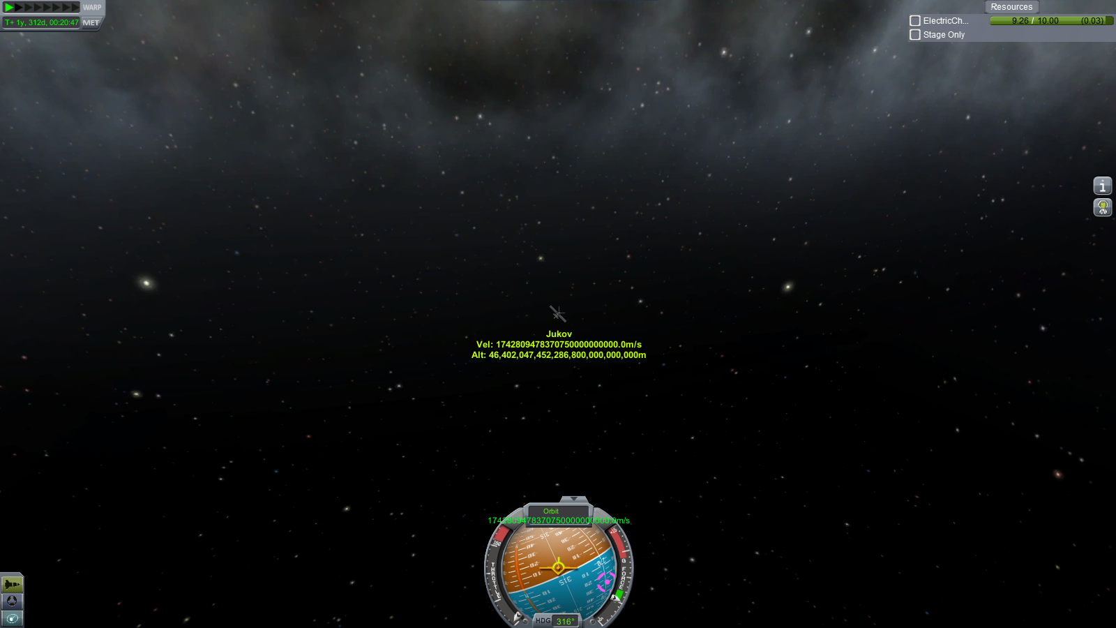 Ich hatte heut einen unschönen Bug. Als ich zu meiner Sonde switchen wollte hat diese einen enormen Boost bekommen. Die Sonde ist jetzt ungefähr 6,2 * 10^24 km/h schnell (ca. "5,8 * 10^15"-Fache Lichtgeschwindigkeit).