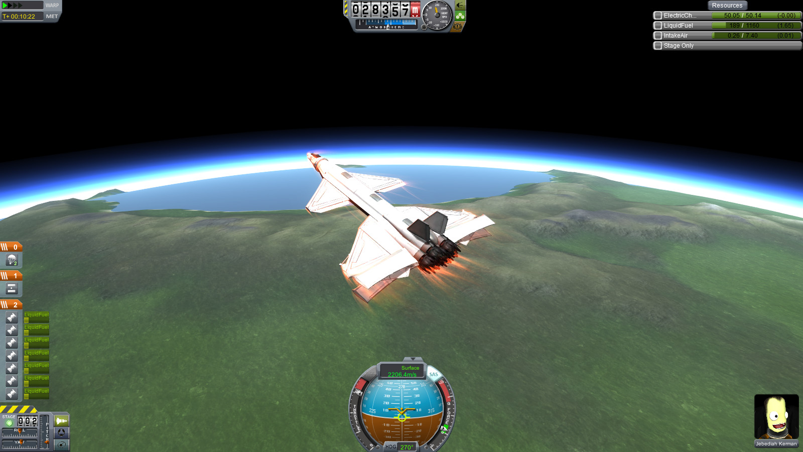 Dann müsste ich auf 5000 Meter fliegen und fast alle Triebwerke abschalten, damit der Treibstoff reicht und dort schafft das Flugzeug nur irgendwas um die 300 m/s und das dauert mir zu lange. Später vieleicht. ...wenn Mechjeb wieder funktioniert.