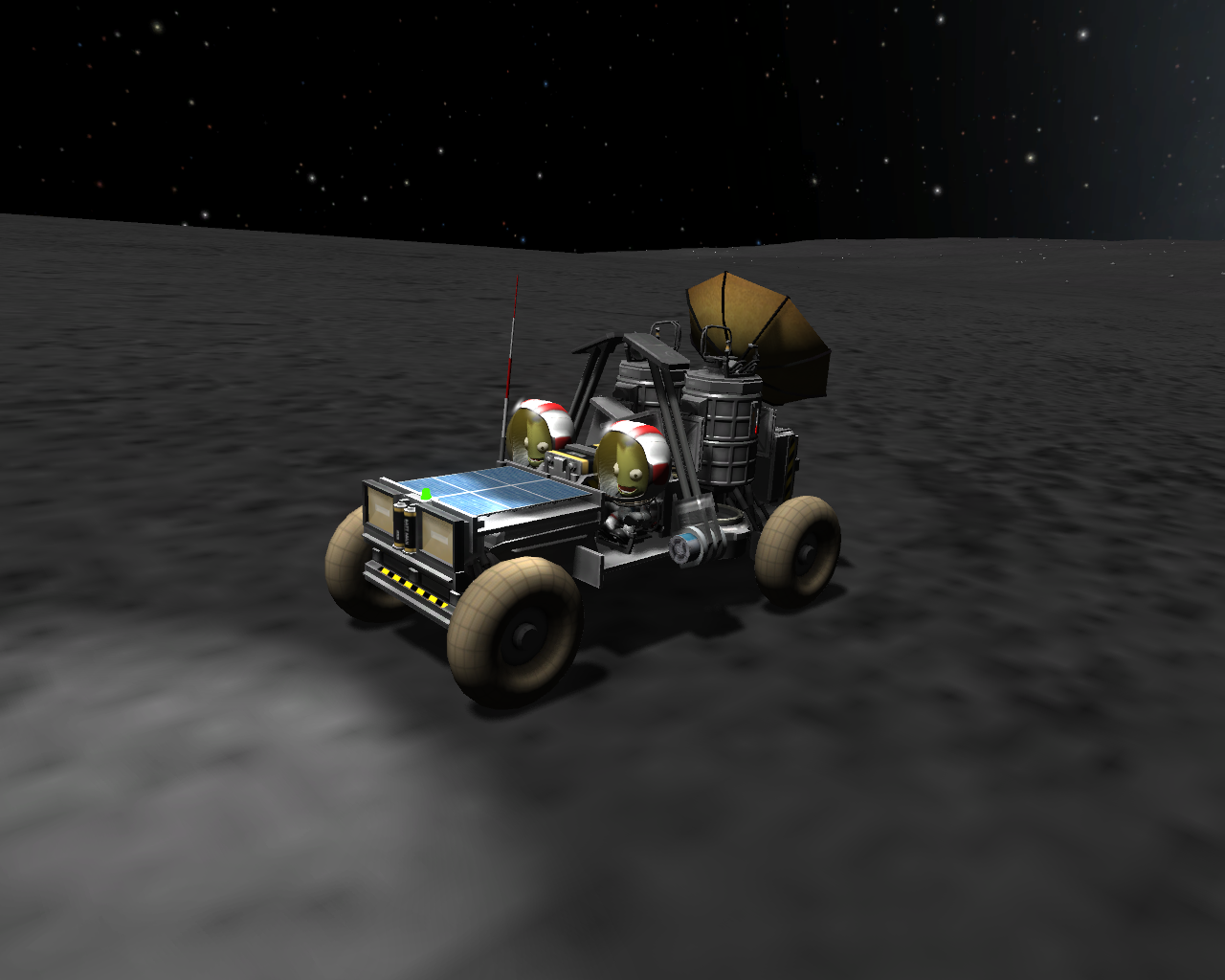 Der alte 2 Mann Rover mit den Satelliten drauf, war zum Teil mit dem Stock-Mod gebaut, hatte ich vergessen. Habe den jetzt nochmal überarbeitet und die Leitern durch Stühle ersetzt und nochmal die Landeeinheit ausgeglichen. Außerdem kann man jetzt auf den kleinen Raketen mitfliegen, bis in einen 50 Km Mun-Orbit. Die Landebeine können den umgekippten Rover wieder aufstellen. Er lässt sich auch ohne Besatzung lenken.