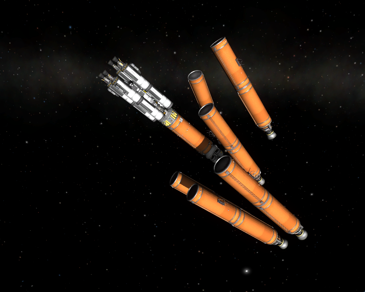 Im Anhang seht Ihr die beschriebene Antriebsstufe im Kerbin Orbit, das Bild ist allerdings vom ersten Versuch, wo der Gravity Turn noch nicht so gut war und etwas weniger Sprit übrig blieb. Wie Ihr seht, ist der große Vorteil an dieser Konstruktion, das man sie auch nochmal volltanken könnte, bevor man endgültig Kerbin verlässt. Damit sollte man dann gefühlt, mindestens 3 K Fuel bei Jool übrig haben. Das zweite Bild zeigt die Stufe mit dem bereits erfolgreich getestetem Tylo-Starter. Ich hatte dieses gedockte Teil schon im Jool Orbit, sogar Aerobrake hat damit geklappt, aber zwei Flüge später gucke ich auf die Map und dieses aufwendig nach Jool gebrachte Mothership, wurde irgendwie aus dem Jool-System katapultiert - und zwar extrem weit^^ -