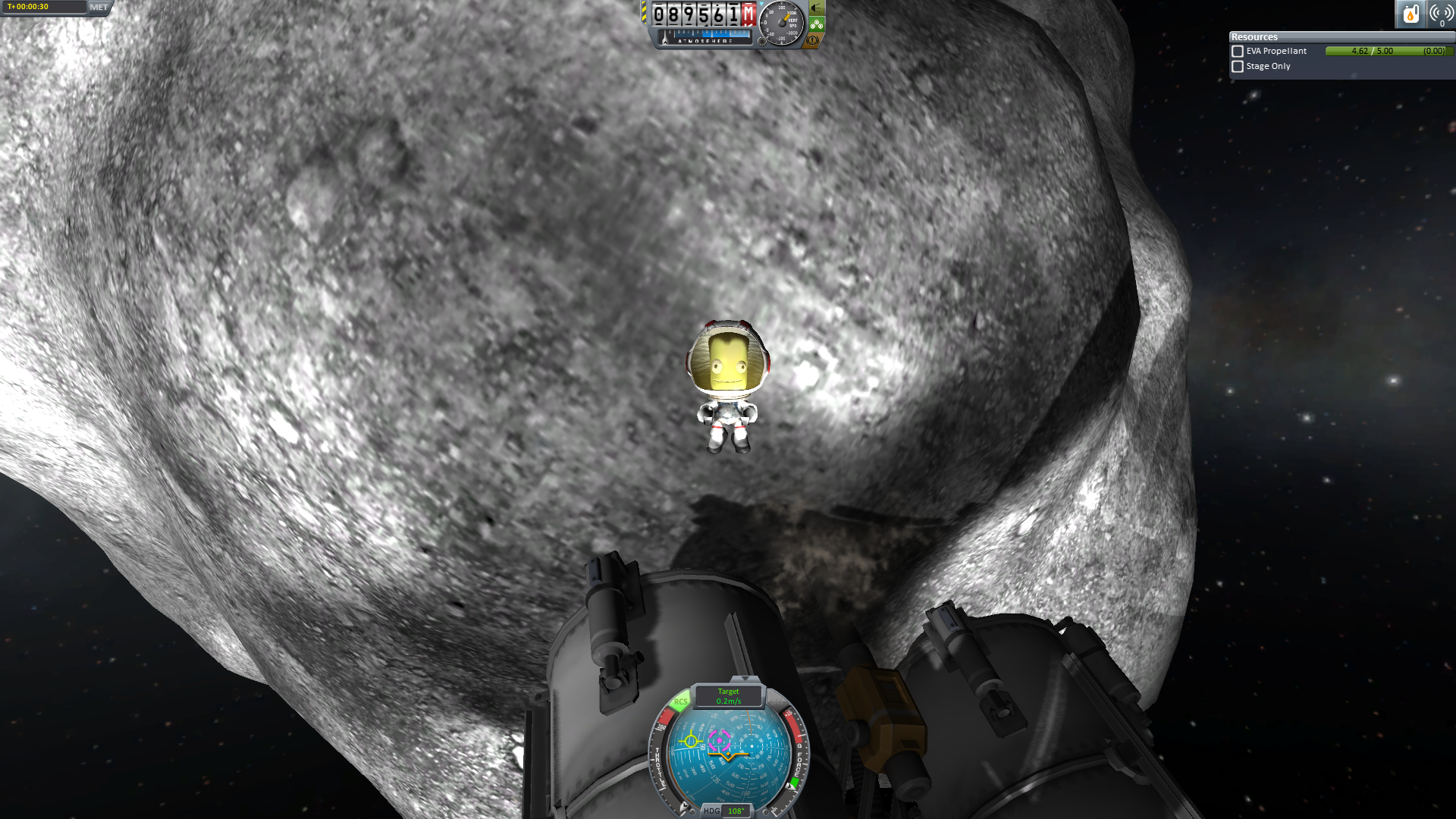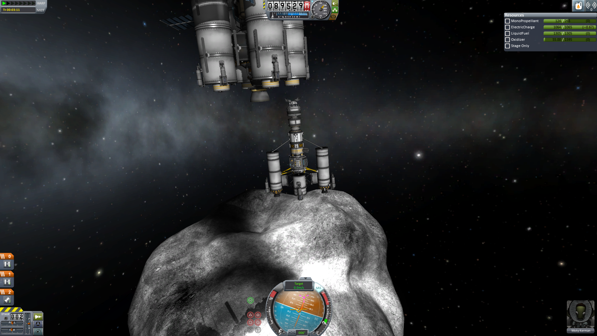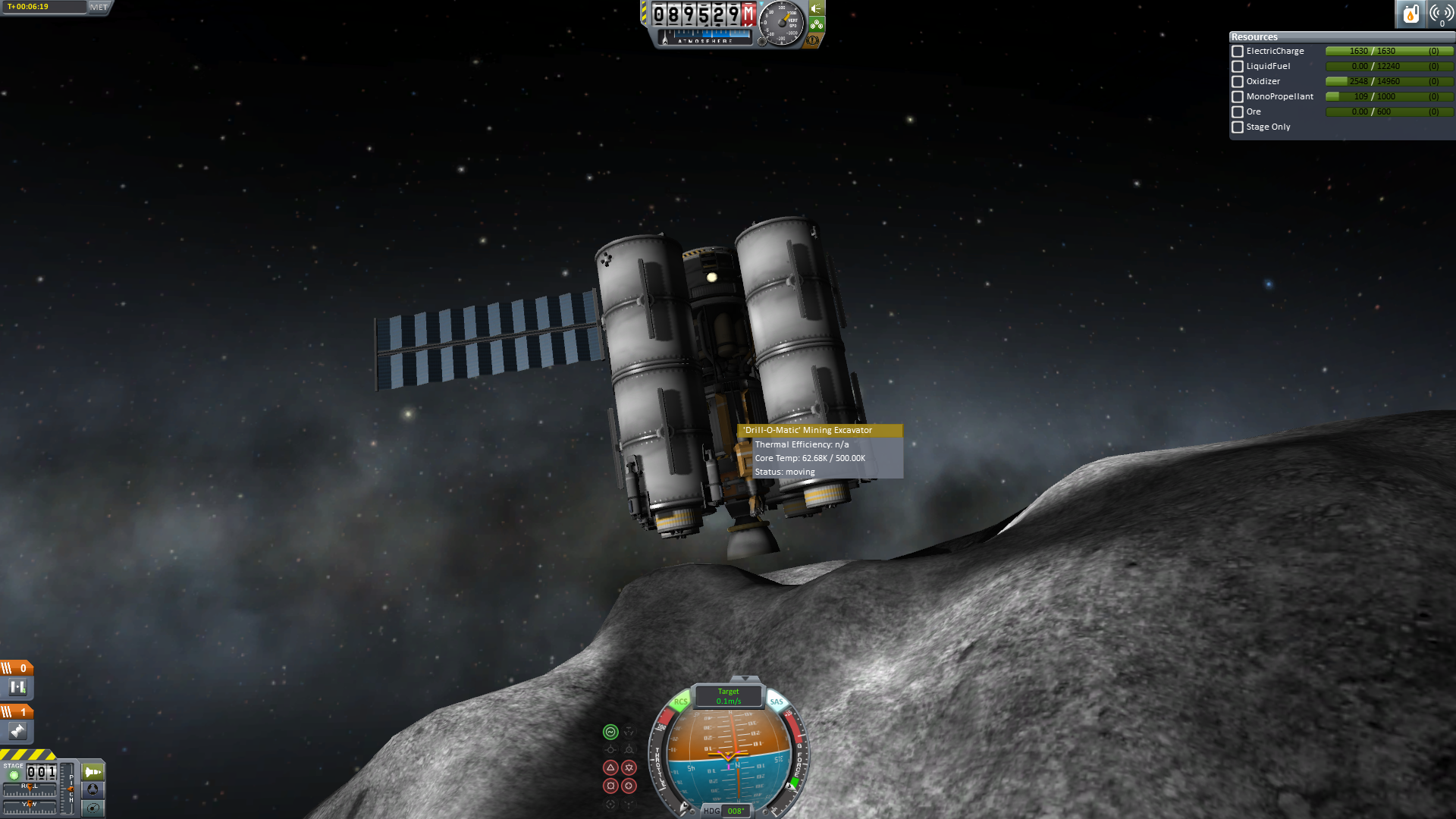 "Nun noch fix nach Ressourcen bohren und weg hier." dachte sich die Crew. Aber wie es scheint reichen zwei Bohrer nicht aus um eine Ressourcenplattform zu fixieren. Also musste etwas umgeplant werden. Der kleine Lander befestigte seine Kralle an der Ressourcenplattform. Das Mutterschiff dockte von seiner Kralle ab und der beide Lander wieder an das Mutterschiff an. Nun wurde das Mutterschiff gedreht. Da der kleine Dockingport ein Andocken in dieser Gewichtsklasse aber sehr erschweren würde, wurde der Ressourcenlander wieder abgetrennt und dockte an der Kralle an. Nun löste er sich vom Kometen und fing das Mutterschiff wieder ein.