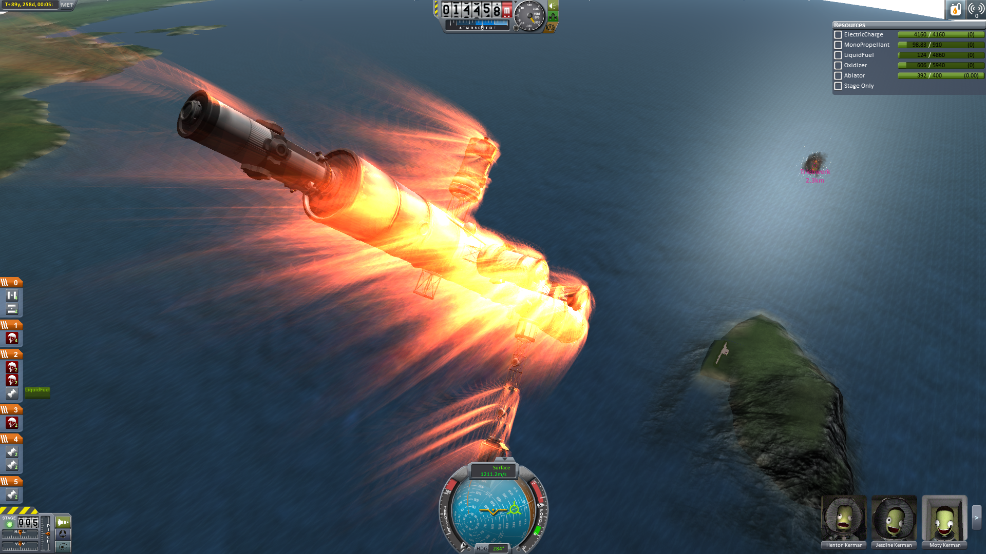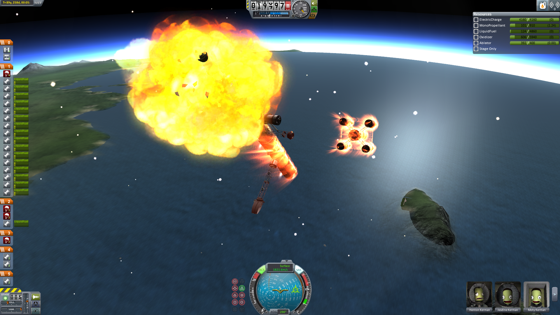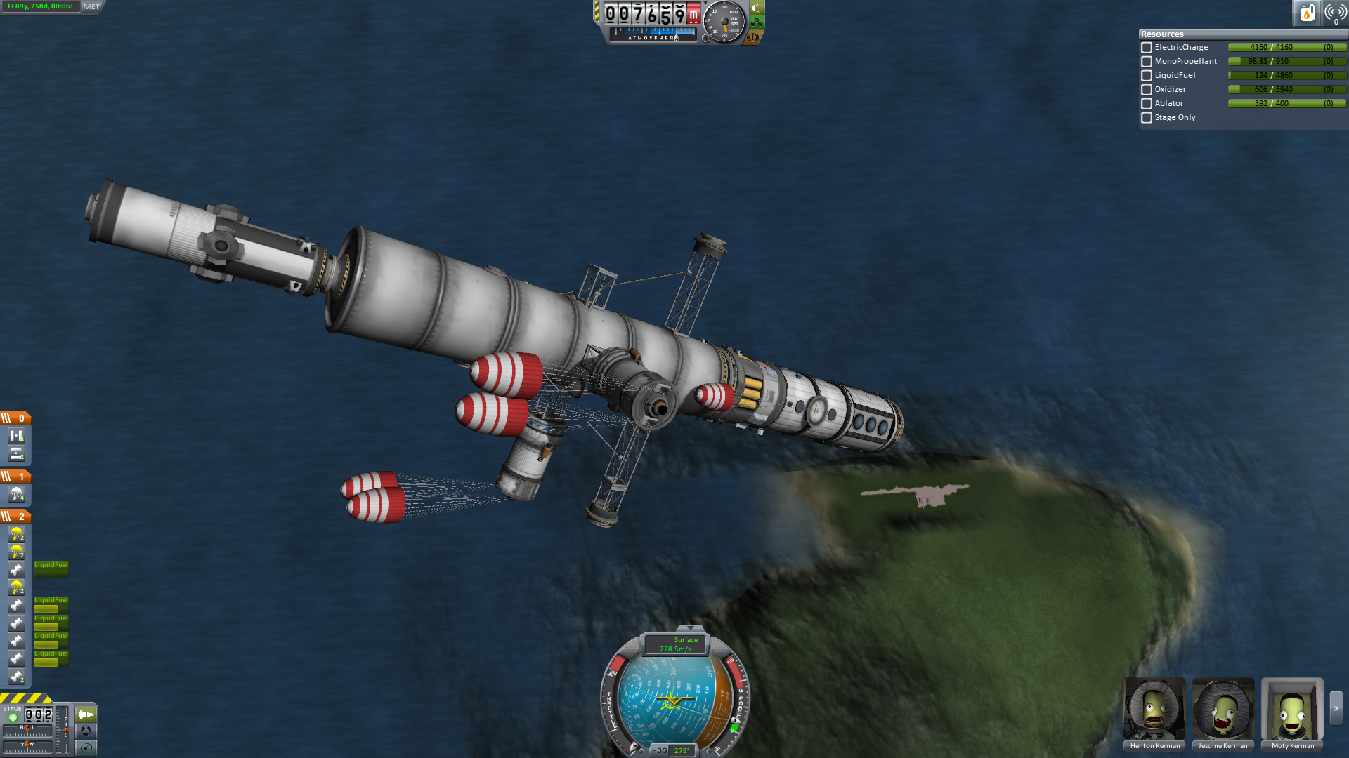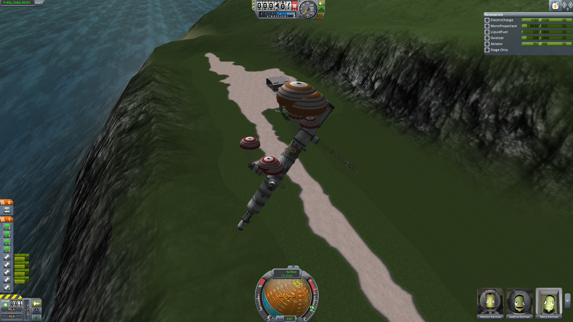 Da noch zwei Sonden an Bord waren, standen außerdem noch weitere Fallschirme zur Verfügung. Die zusätzlichen Fallschirme, die Träger die gegen ein Umfallen schützen und die Tanks die einen Puffer gegen den Aufprall boten, ermöglichten eine vollkommen sichere Landung.Die Landung erfolge direkt neben der Landebahn des Inselflughafens, deshalb wurde das Abschiedsfoto direkt vor Ort gemacht. Leider entschieden sich alle Kerbonauten mit ausdrucksloser Miene andauernd in eine Richtung zu schauen. Der Fotograf ist fast verzweifelt. Dies ist das beste aller Fotos (immerhin schaut keiner demonstrativ weg und zwei sehen sogar direkt in die Kamera!). Warum sie sich so verhalten wird nun ein Team an Psychologen klären. Vielleicht sind sie einfach nur schüchtern und müssen sich wieder an andere Kerbals gewöhnen.
