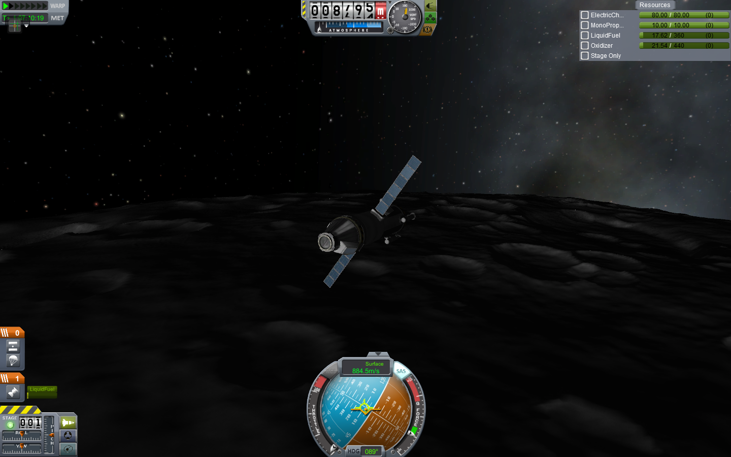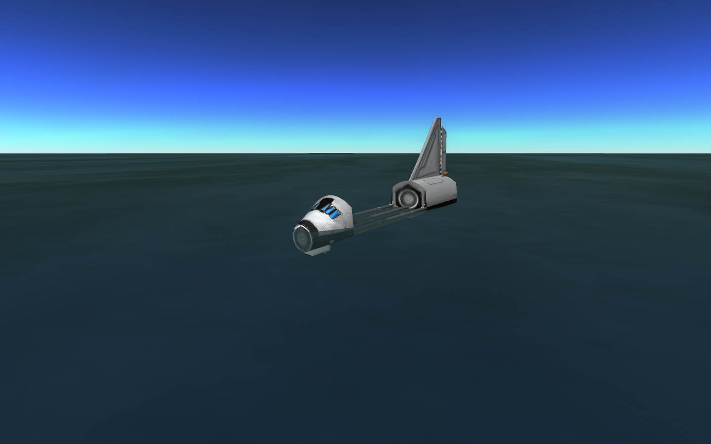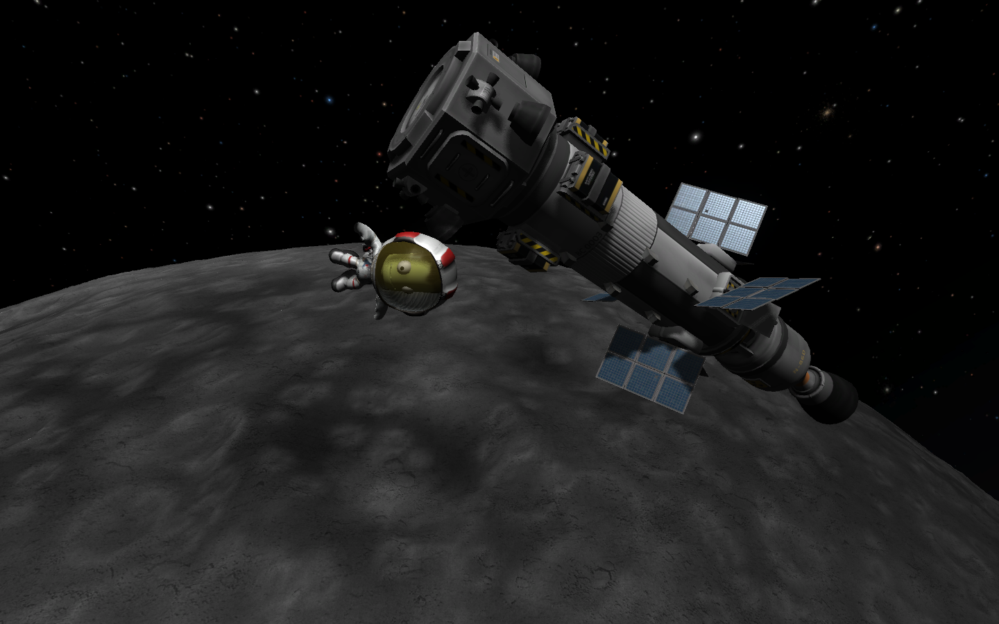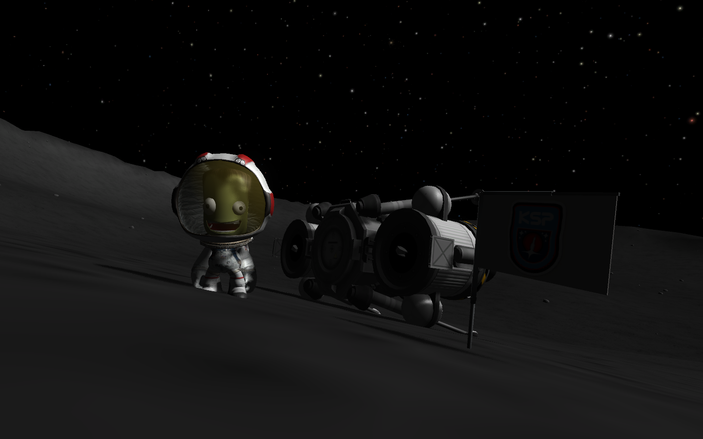 Zunächst einmal muss ich sagen, dass die Rakete für einmal Mun und zurück total overpowert ist. Der Hinflug und das Landemanöver verliefen problemlos, aber leider musste ich ja unbedingt an einem Hang landen und so hab ich mich erstmal mehrfach überschlagen bis der Lander endlich auf der Seite zum liegen kam. Start vom Mun und Rendevou mit dem Mutterschiff verliefen ebenfalls problemlos, aber dann fingen die Probleme an: Mir ist erst da nämlich aufgefallen, dass der Lander überhaupt keinen Dockingport hat. Einfach umsteigen ging nicht, da ich schlauerweise auch einen Kerman in die Landekapsel gesetzt hatte. Also hab ich mich mit meinem Kerman einfach an die Leiter des anderen Comandpods rangeklammert und hab dann damit meinen Burn nach Kerbin durchgeführt. Und so ist der Kerman dann den ganzen Weg EVA neben dem Raumschiff nach Kerbin zurückgeflogen und hat sogar den Wiedereintritt auf der Leiter überstanden. Und etwa 5km über der Oberfläche, als ich mir gedacht hab "jetzt hab ich das schlimmste hinter mir" bemerk ich erst, dass es überhaupt keine Fallschirme gibt und so sind beide Kerman letztendlich ins Meer gestürzt...
