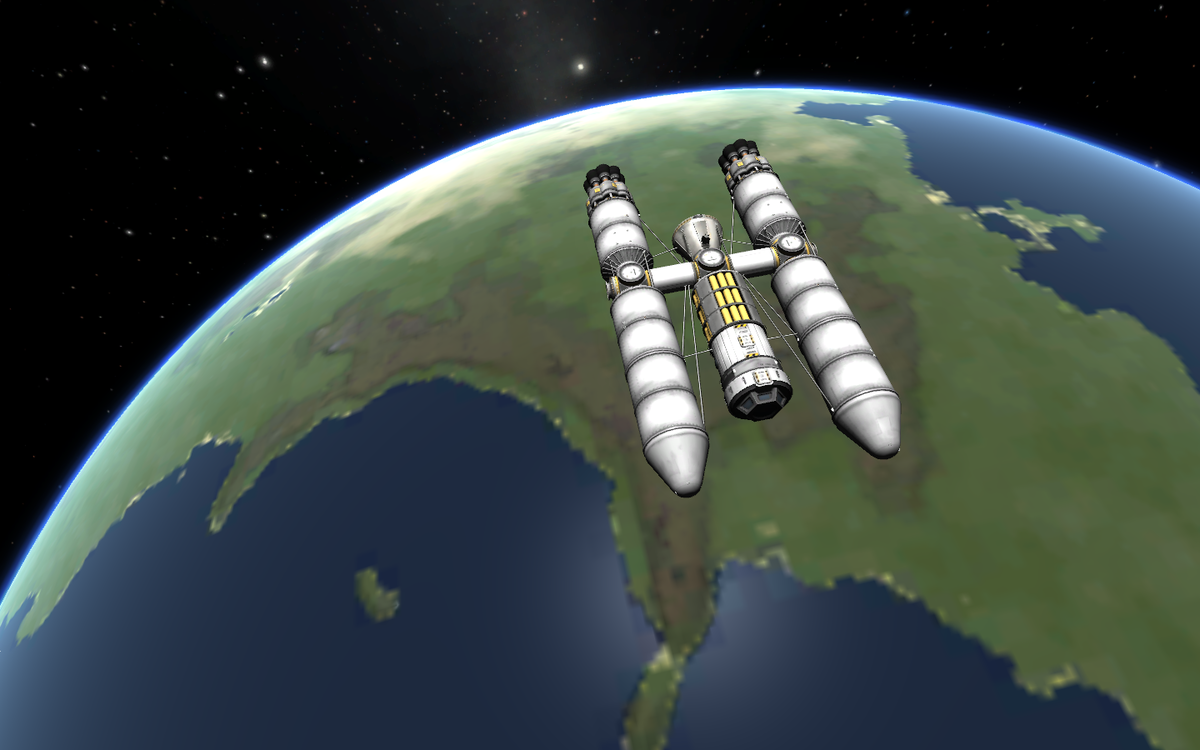 Mein neuer interplanetarer Frachter nach dem Spacetruck-design d.h. Vorne ist das Zugmodul und die Ladung wird hinten dran gehängt. Dieses Design soll für mehr Stabilität bei der Beschleunigung sorgen, da zusammengedockte Schiffe mit Heckantrieb oft ziemlich heftig herumwabbeln. Weitere tolle Features: Schöne Aussicht, 16 gebündelte Atomtriebwerke die zusammen 960kN Schubkraft liefern sowie über 8500 l Treibstoff
