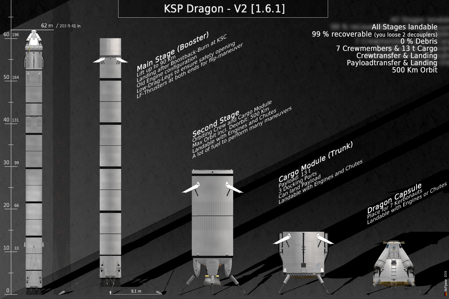 Die soweit fertige Version meiner Dragon V2. Einige Unterschiede fallen euch Profis bestimmt schon auf... Habe sie speziell für die Karriere entwickelt, mit guter Preis/Leistung und geringer Bauteileanzahl. Zudem soll sie auch wirklich zuverlässig funktionieren und ordentlich Crew und Nutzlast befördern können, was mir mit dieser Version ganz gut gelungen ist.
