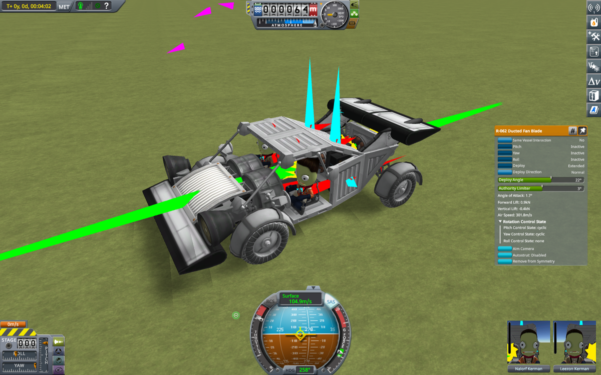 4 EM-165 Light Duty Motoren mit jeweils 8 R-062 Ducted Fan Blades liefern brutale Leistung. Front und Heckspoiler verringern die Bodenhaftung, damit die Räder nicht explodieren. Beschleunigung von 0 auf 100km/h in unter 3 Sekunden, getestete Höchstgeschwindigkeit über 370km/h. Im "Cruising Mode" bei einem Propeller Anstellwinkel von 10° und 1/3 Schubkraft (150 RPM) hält das Fahrzeug auch in schwierigen Terrain eine Geschwindigkeit von 13-17m/s und kann 'afk' selbstständig und sicher fahren. Der Spritverbrauch liegt hochgerechnete bei 7,3 LF / 5,9 OX auf 100km, was umgerechnet 66kg oder 89 Liter Benzin entspricht. ![]()