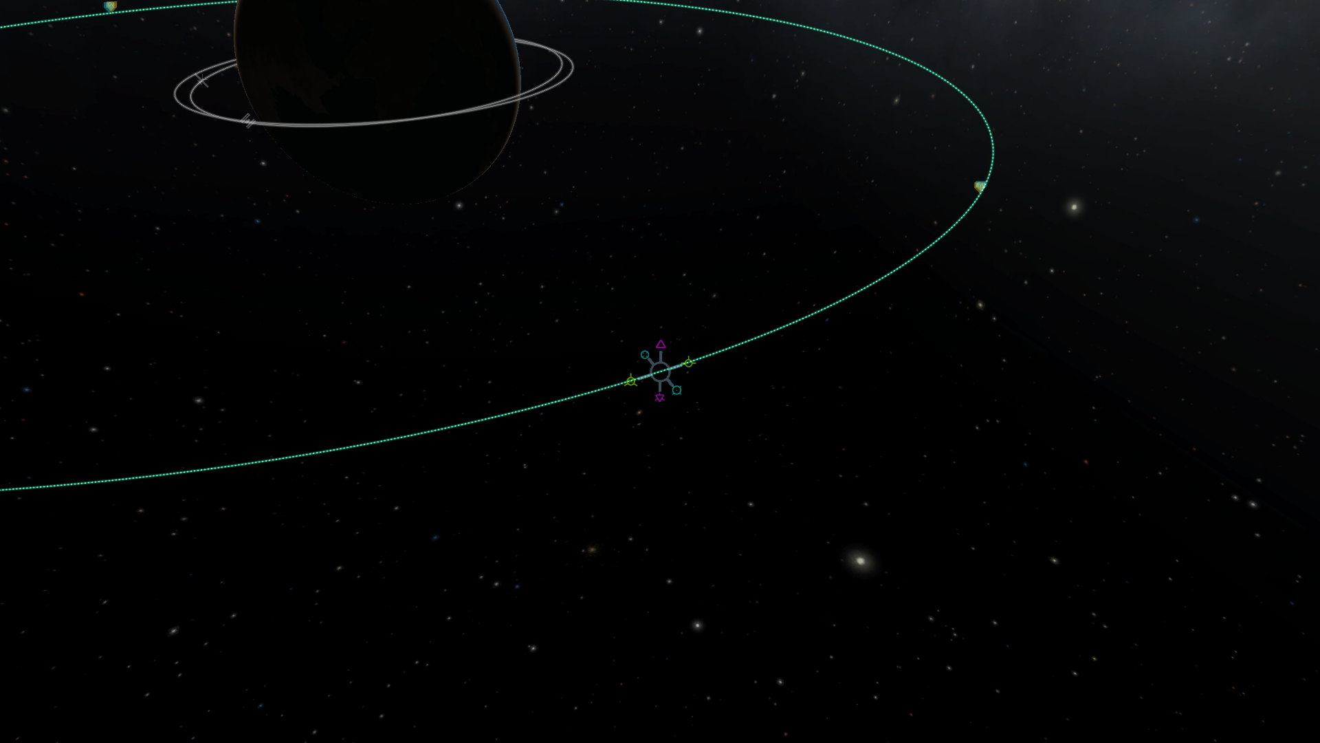 Mit ihm plant man das ganze Manöver. Er besteht aus einem Kreis (oder Kugel) mit sechs farbigen Symbolen, die für die drei Bewegungsachsen stehen, und dem voraussichtlichen Zielorbit, der als orangene Strichlinie dargestellt wird. Hält man mit der Maus den Kreis fest, kann man den MP jederzeit an eine beliebige Stelle auf dem aktuellen Orbit verschieben, um z.B. den richtigen Zeitpunkt für einen Transfer herauszufinden. Auf geplanten Manövern können auch weitere Punkte platziert und bewegt werden, doch dazu später mehr. Die sechs Symbole stehen einfach gesagt für vorwärts und rückwärts, links und rechts, rauf und runter beschleunigen. Am meisten benutzt man die gelben Symbole für den Schub, die anderen sind mehr für's Feintuning da, um z.B. seinen Orbit zu neigen oder einen anderen Planeten genau zu treffen.