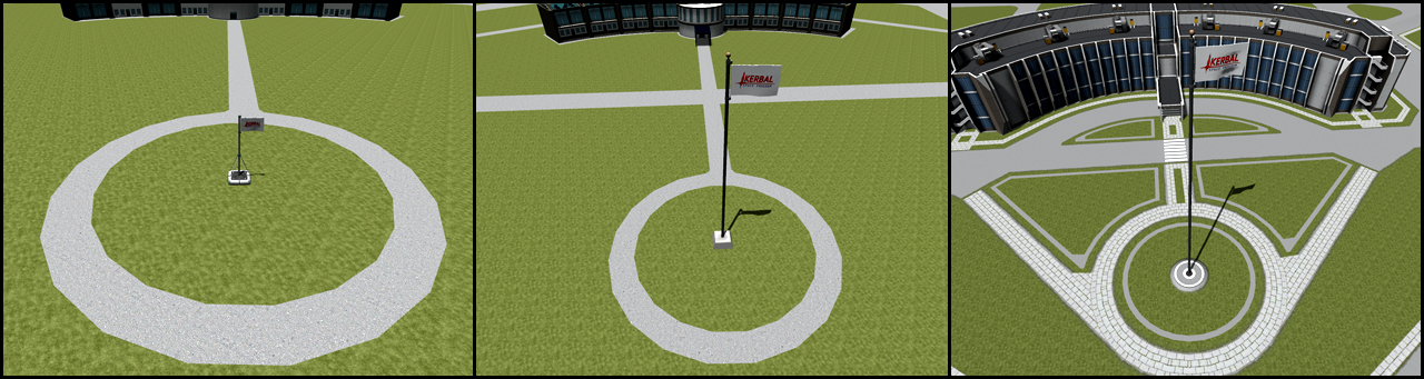 Es gibt am KSC zwei Flaggenmasten von denen einer direkt am Astronaut Complex steht und angewählt werden kann. So kann man jederzeit die Flagge ändern, welche dann auch auf manchen Bauteilen zu sehen ist. Die Flagge lässt sich aber auch jeweils im VAB oder SPH ändern. Der Flaggenmast ist an den Astronaut Complex gebunden und mit ihm gelevelt.