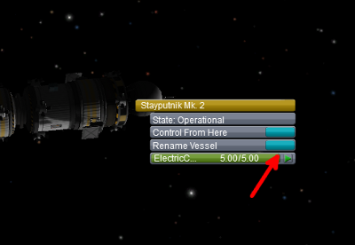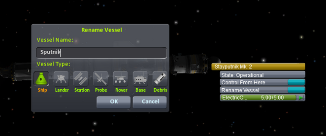 Mit einem rechten Mausklick auf das Kommandomodul öffnet sich ein Fenster mit Informationen und Optionsmöglichkeiten. Mit "Rename Vessel" benennt man das Raumfahrzeug um.