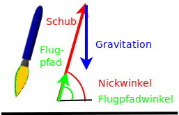 [absatz][/absatz] Es bildet sich ein Anstellwinkel (Angle of attack) zwischen Flugpfad und der Schubrichtung. Ist der Nickwinkel auf 80° angekommen, wird der Winkel noch kurz beibehalten um die Anstellwinkel wieder auf 0° zu bekommen. Man wartet also bis der Geschwindigkeitsvektor wieder in Richtung Raketenlängsachse zeigt. Der Anstellwinkel ist damit wieder bei 0° angekommen.