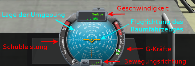 Auf der Startrampe steht die Trägerrakete senkrecht und zeigt gen Himmel. Daher Ist die Ausgangslage 0° in Alle Richtungen. Neben der Flugrichtung und der Lage der Umgebung gibt der künstliche Horizont in KSP weitere Informationen zurück: