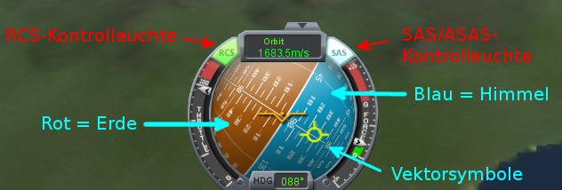 Der Künstlicher Horizont (Oder: Navball) gibt die Lage des Flug- oder Raumfahrzeuges im Bezug auf seine Umgebung wieder.